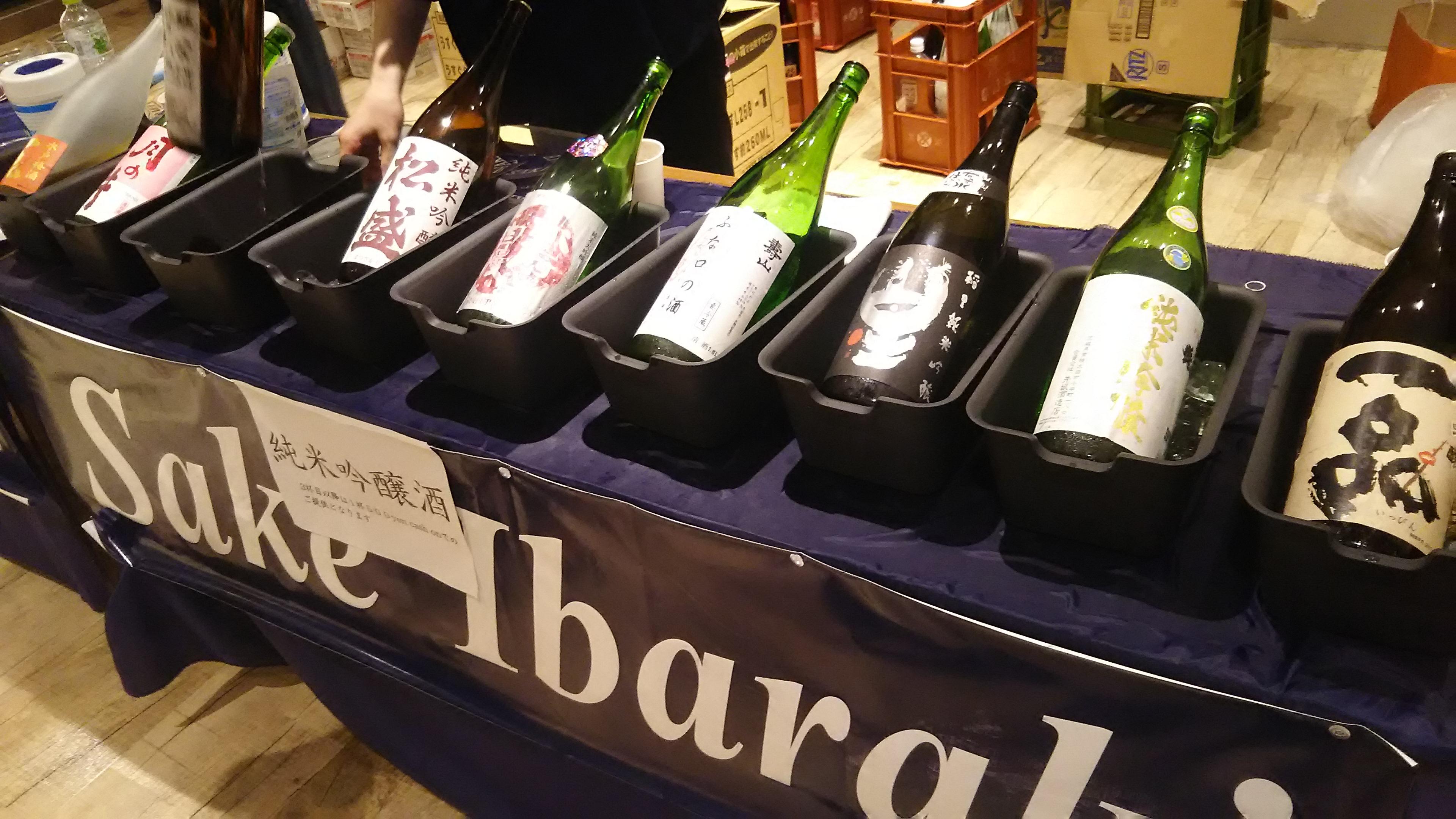 日本酒コーナーのテーブルには茨城県内の8つの蔵元さんのお酒が純米吟醸と純米酒、それぞれに並べられていました。しかも、蔵元さん自らがお酒を注いでくれるサービスぶりです!この日は、『水府自慢』を造る水戸の明利酒類の川口さん、『富久心』を造る十王町の椎名酒造の椎名健二郎さん、『松盛』を造る常陸太田の岡部酒造の岡部彰博さん、そして水戸の『一品』の吉久保さん、の4蔵を代表する方々が顔をそろえていました。