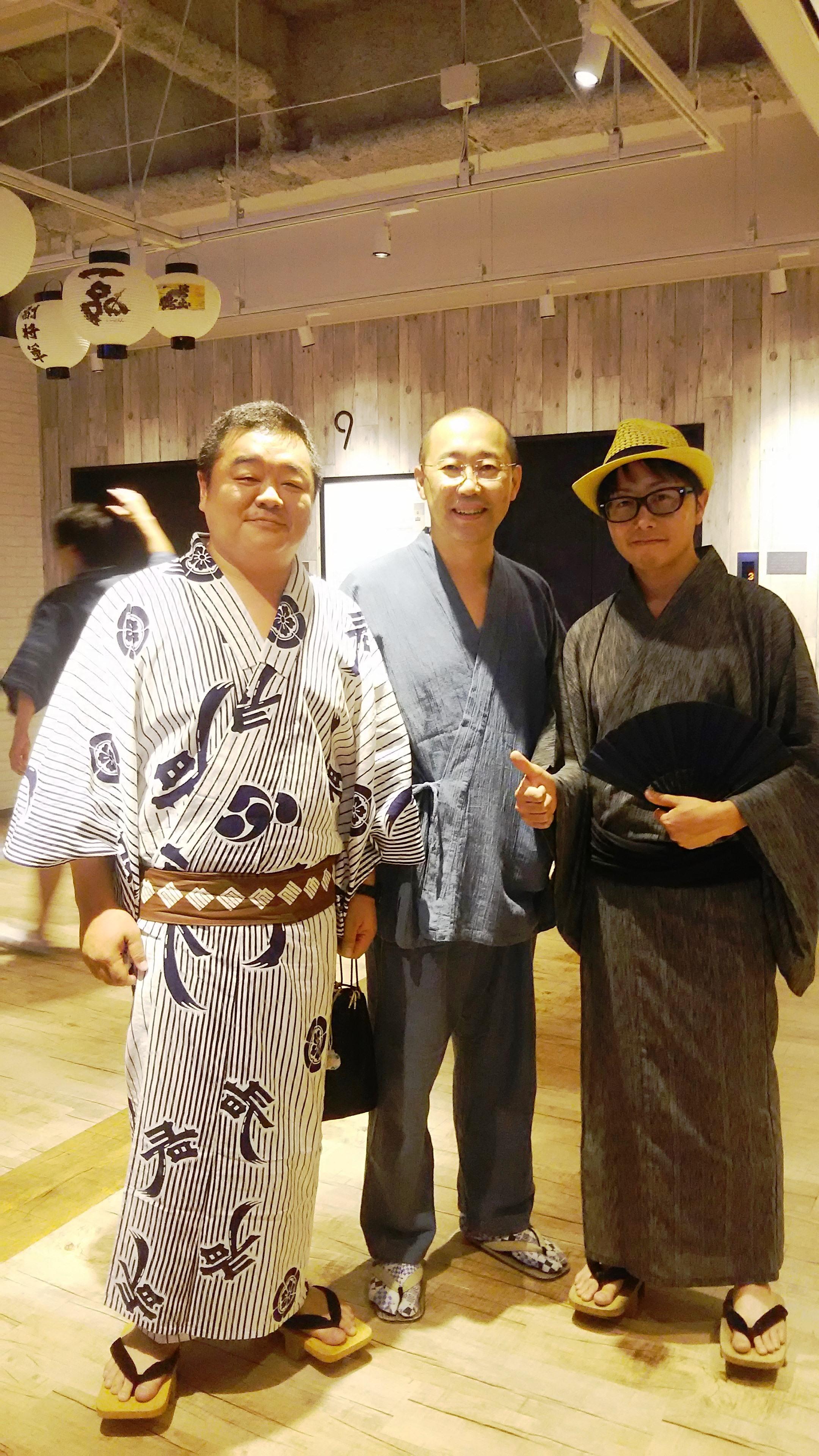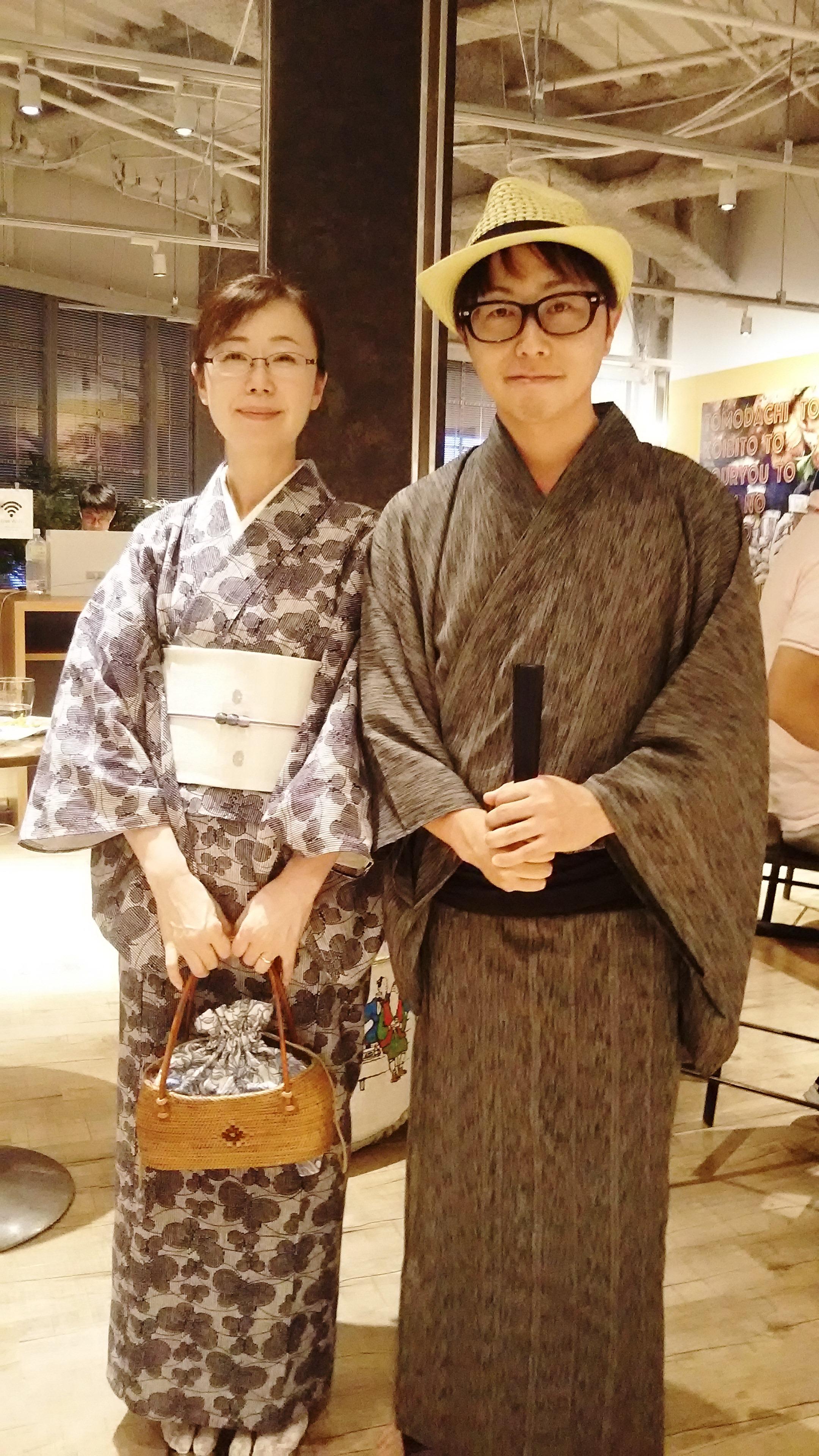 その日本酒イベントは、『酒BAR Vol.2』というもので、1回目の音楽と日本酒のイベントに続く第二弾で、今回のテーマは『浴衣(ゆかた)で日本酒パーティ!』となっていましたので、みどりさんは浴衣、私は作務衣を着て会場に行きました!