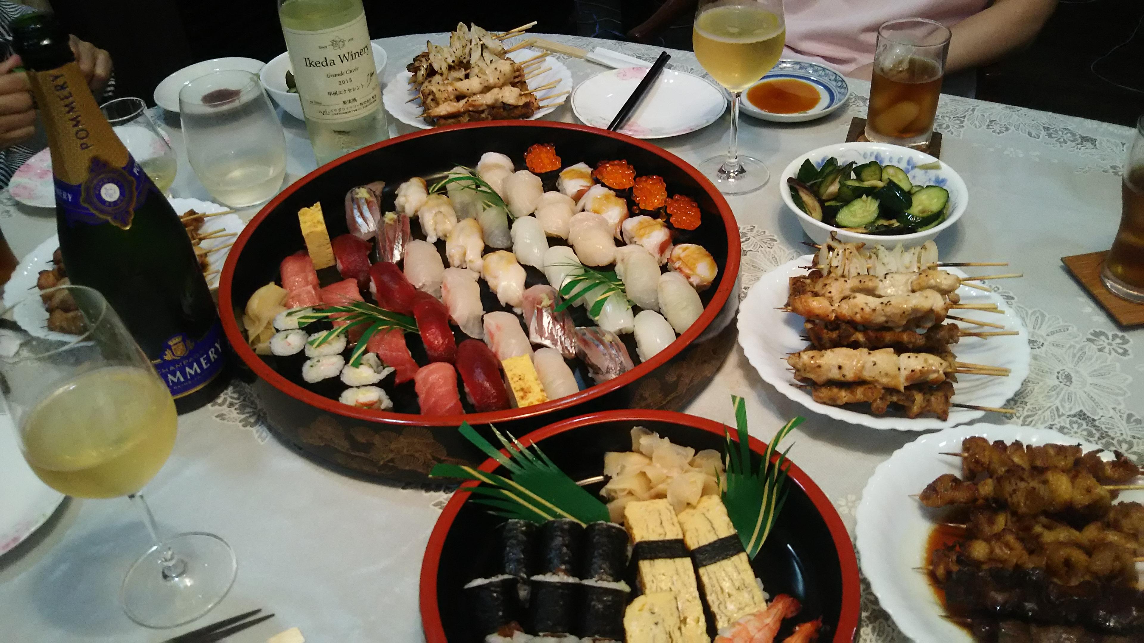 新鮮なお寿司と焼きたての焼き鳥が揃ったとなると、後は旨い酒ですね~!もちろん、酒屋ならではの料理に合うお酒を色々と用意しました。今回はちょっと奮発して乾杯にはシャンパン(ポメリー)、その後はイケダワイナリーさんの『イケダ・甲州エクセレント』上品な甘みと柔らかな酸味が、お寿司とも良く合い、焼き鳥の脂をスッキリと洗い流してくれます。