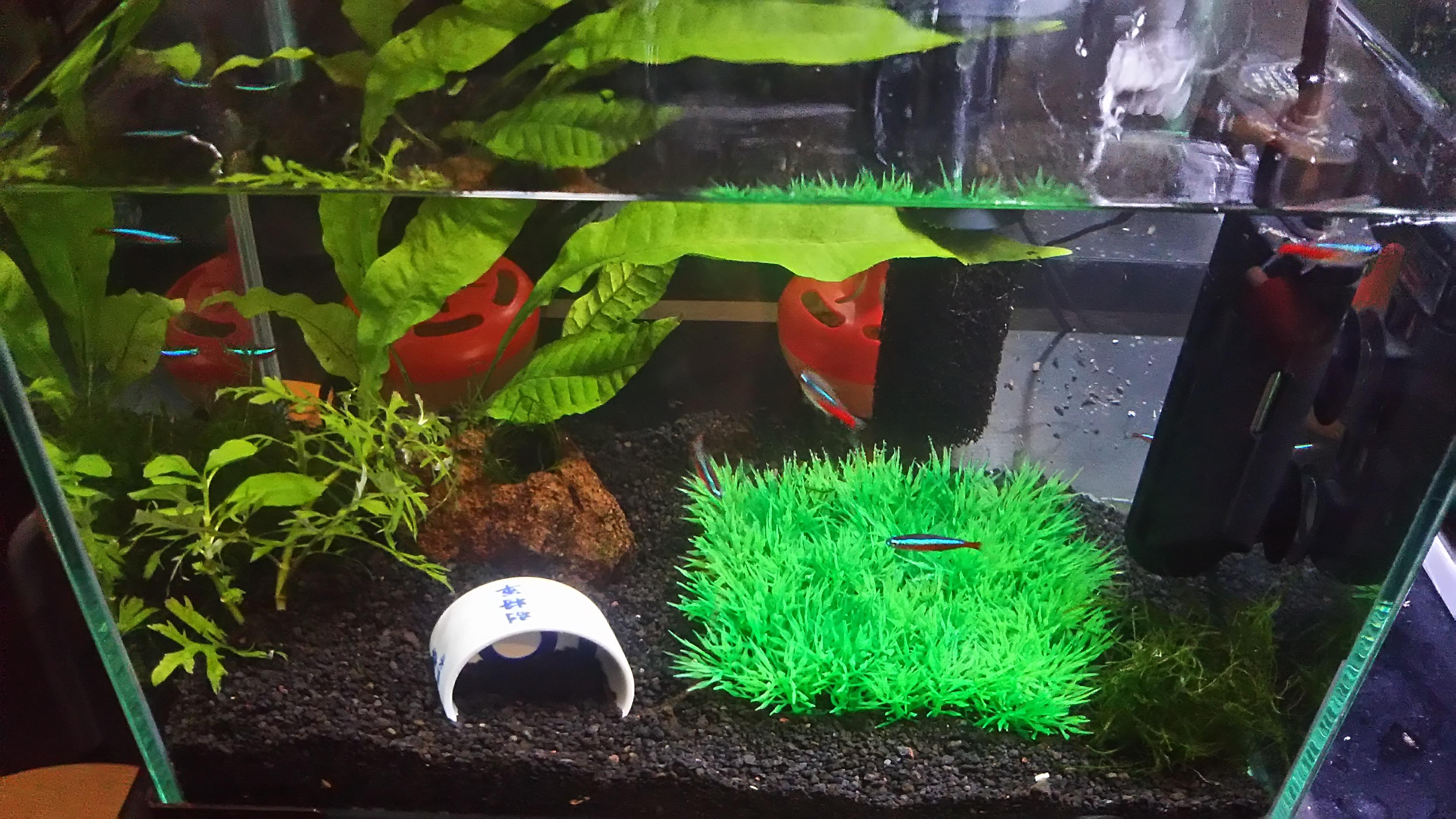 新しい水草の入った水槽は、今までとは見違えるような美しさで、中にいる『ネオンテトラ』や『カージナルテトラ』、『ミナミヌマエビ』たちも、心なしか嬉しそうに見えます。最初の頃は、奥のほうに固まっていましたが、だんだんと元気に泳ぎだし、エビも負けじと水槽の中を所狭しと泳ぎ回っていて、あまりに元気過ぎるので心配になってしまうほどです(笑)
