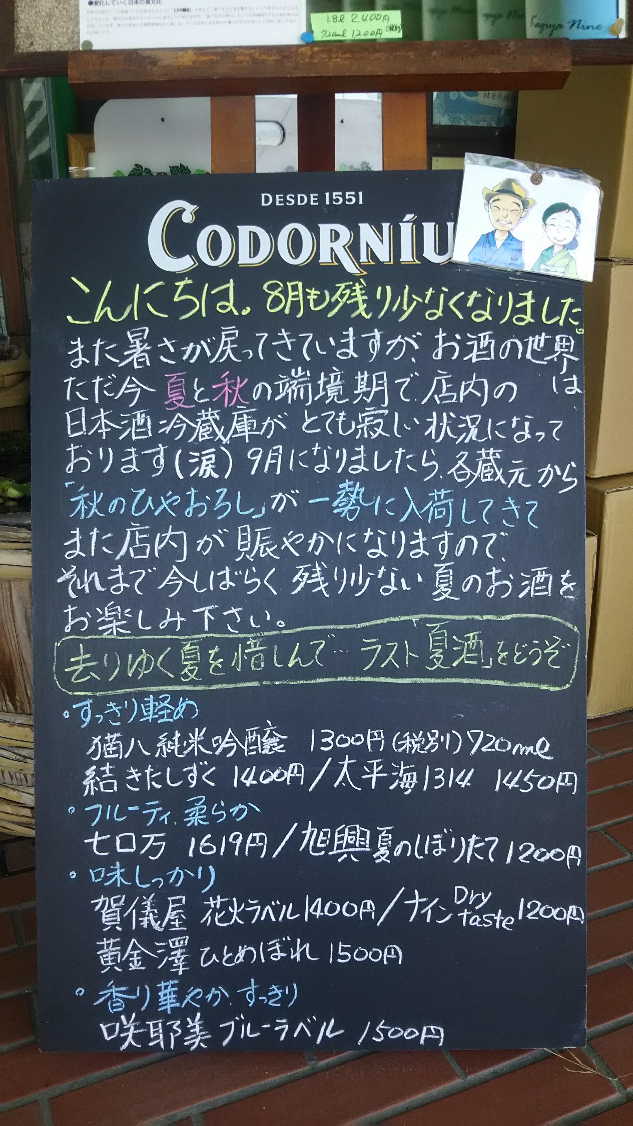 私の店でも、『夏酒』と『秋酒』の端境期となる今の時期は、店内の日本酒冷蔵庫がとても寂しい状態となっており、毎年頭を悩ませています。9月になれば各蔵元様から『ひやおろし』が入荷してきますが、幸運にも?今週は残暑が厳しくなるそうなので、『ラスト夏酒』を飲んで去りゆく夏を満喫してみませんか・・・(笑)