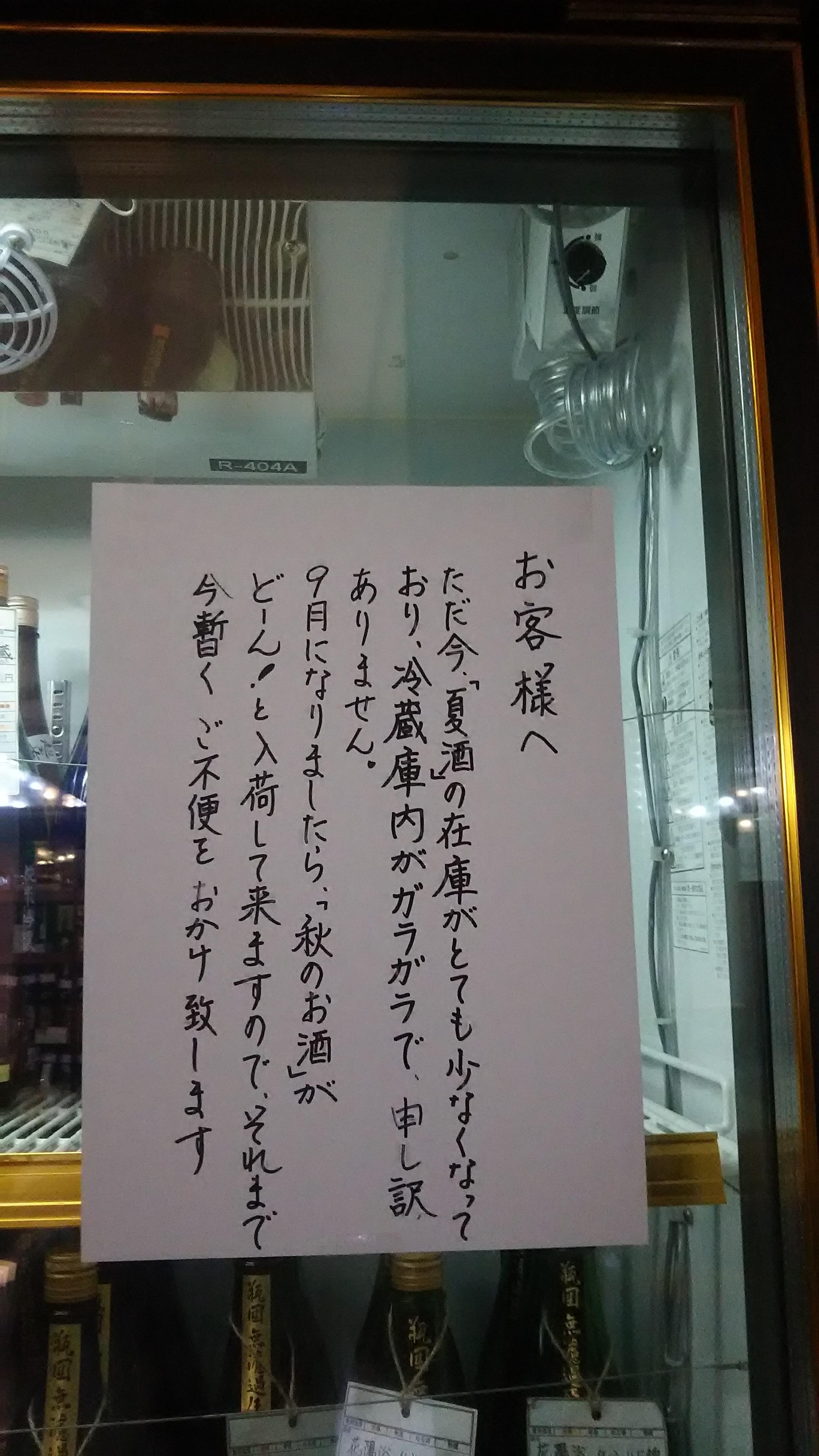 先日のブログで、最後の夏酒を楽しみませんか~!と言う話をしたところ、嬉しいことに、たくさんの方にご来店いただき、次々と残り少ない夏酒をお買い上げ頂いてます。中には、『最後の一本』ばかりをまとめて選ばれる方もいて、酒屋としては涙が出るくらいにありがたく思っています。その反面、更に冷蔵庫の中がスカスカになってしまい、かなり寂しい状態になっています!