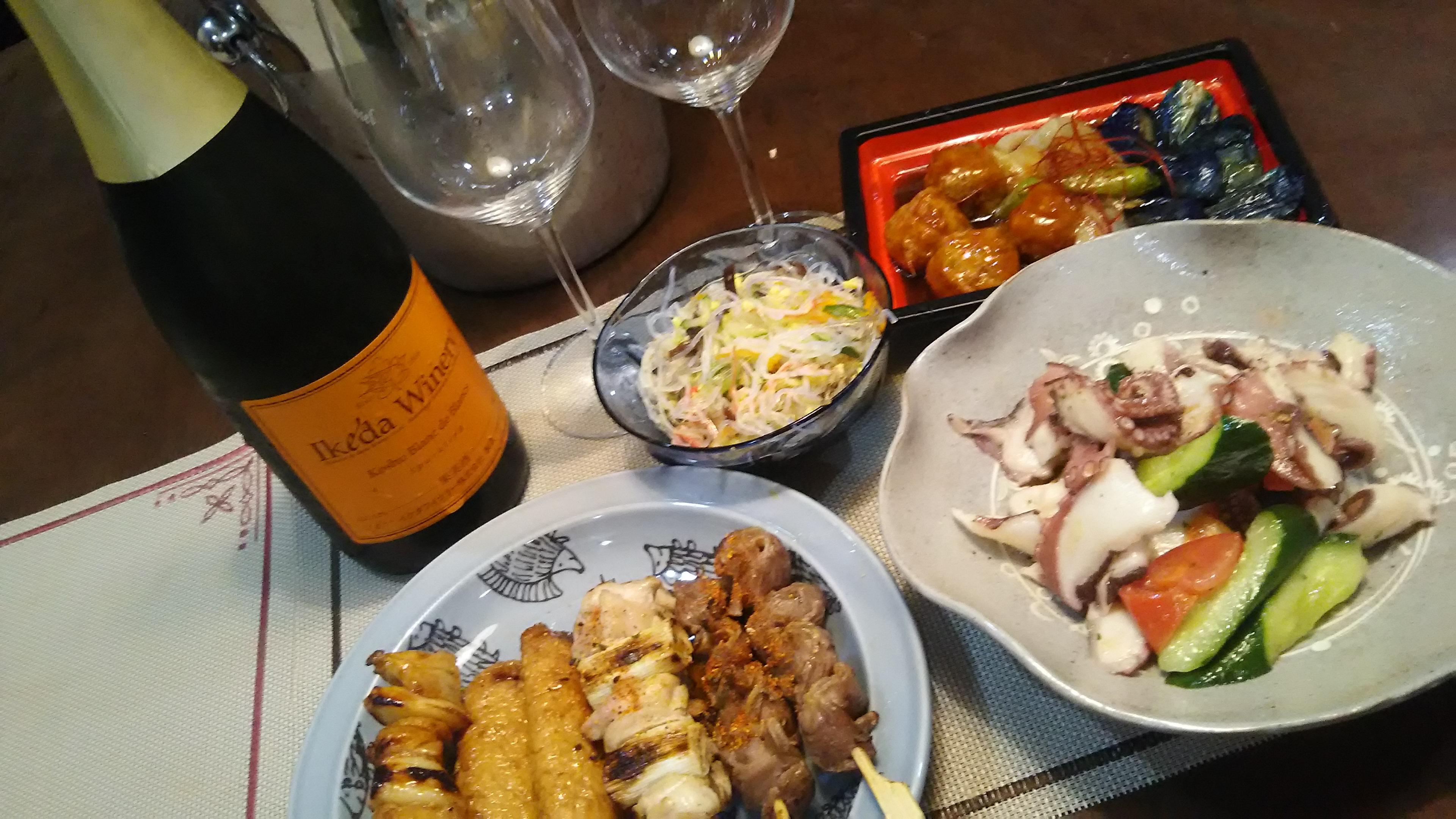 そこで、秋本番に向けて我が家でも『暑気払い』を行おうということで、清涼感のあるスパークリングワインと夏の疲れを癒してくれる『夏野菜』や『タコ』を使った料理(いつもの総菜ですが)を用意して、みどりさんと二人ささやかに行いました。