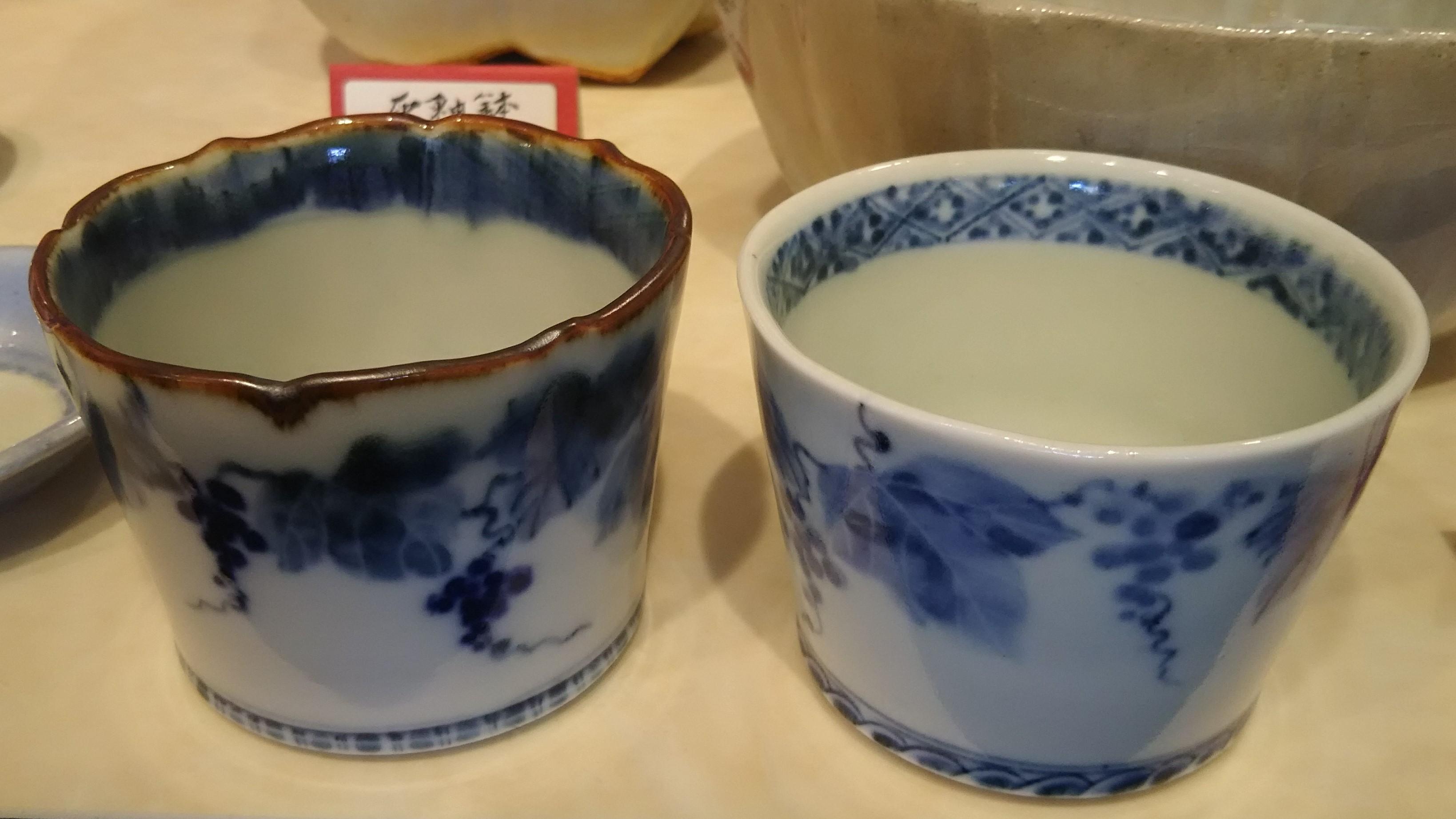 今日は、偶然にも作者である『八十島ご夫妻』にお会いすることができ、今回の作品のことやお酒に関する話、お酒を飲むときの器のこと、等、様々なお話をさせていただき、とてもすてきな時間を過ごすことができました。中でも印象に残ったのが、今回買い求めた蕎麦猪口にも、現在愛用している物にも同じ葡萄の絵が描かれていたので、その理由を聞いてみたところ、単にブドウが好きでついつい描いてしまうだけで、深い理由はないとのお答えでした(笑)。こんなことも、直接会って見ないと聞けない話だと思いました!