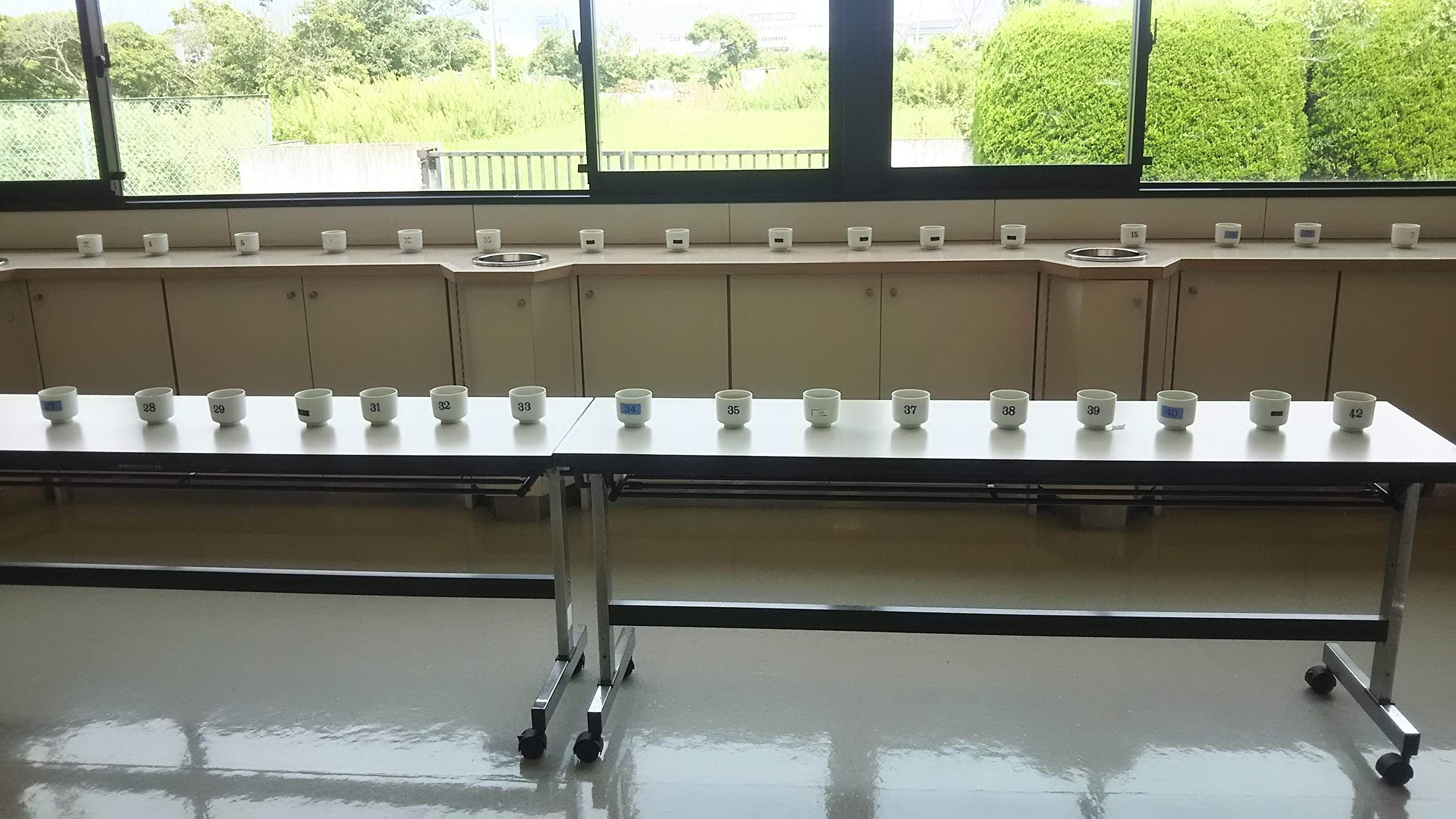 そして、ここからが今回のメインイベント、『市販酒42種類の唎酒』が始まりました。番号のついた利き猪口に入ったお酒がテーブルの上に整然と並べられ、1番から順番に唎酒を行っていきます。もちろん、商品名などは一切わかりません!約1時間の間にすべてのお酒を味わって、その香りや味わいの特徴はもちろんのこと、特出した点や悪い点などを手元の資料に書き込んでいきます。