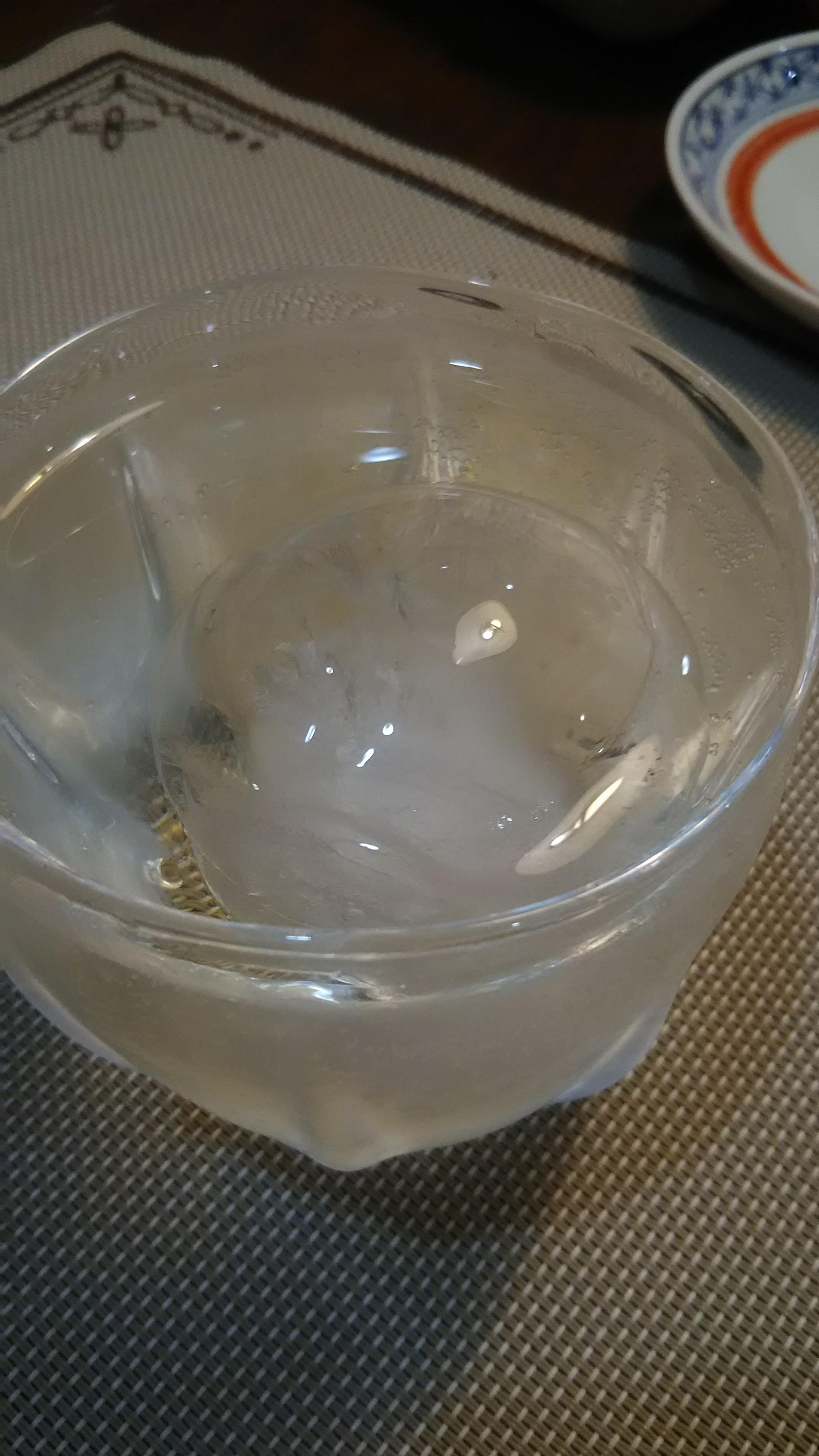 さて肝心の丸氷を入れたお酒の味わいですが、アルコールが柔らかく感じ、いつもよりも美味しい!とみどりさんも絶賛していました。見た目から美味しいはず!と思い込んでいる部分も多少なりともあるのでしょうけれど、その『思い込み』も大切だと私は思っています。お気に入りのグラスやおしゃれなグラスで飲むと、より一層美味しく感じるのと同じです。