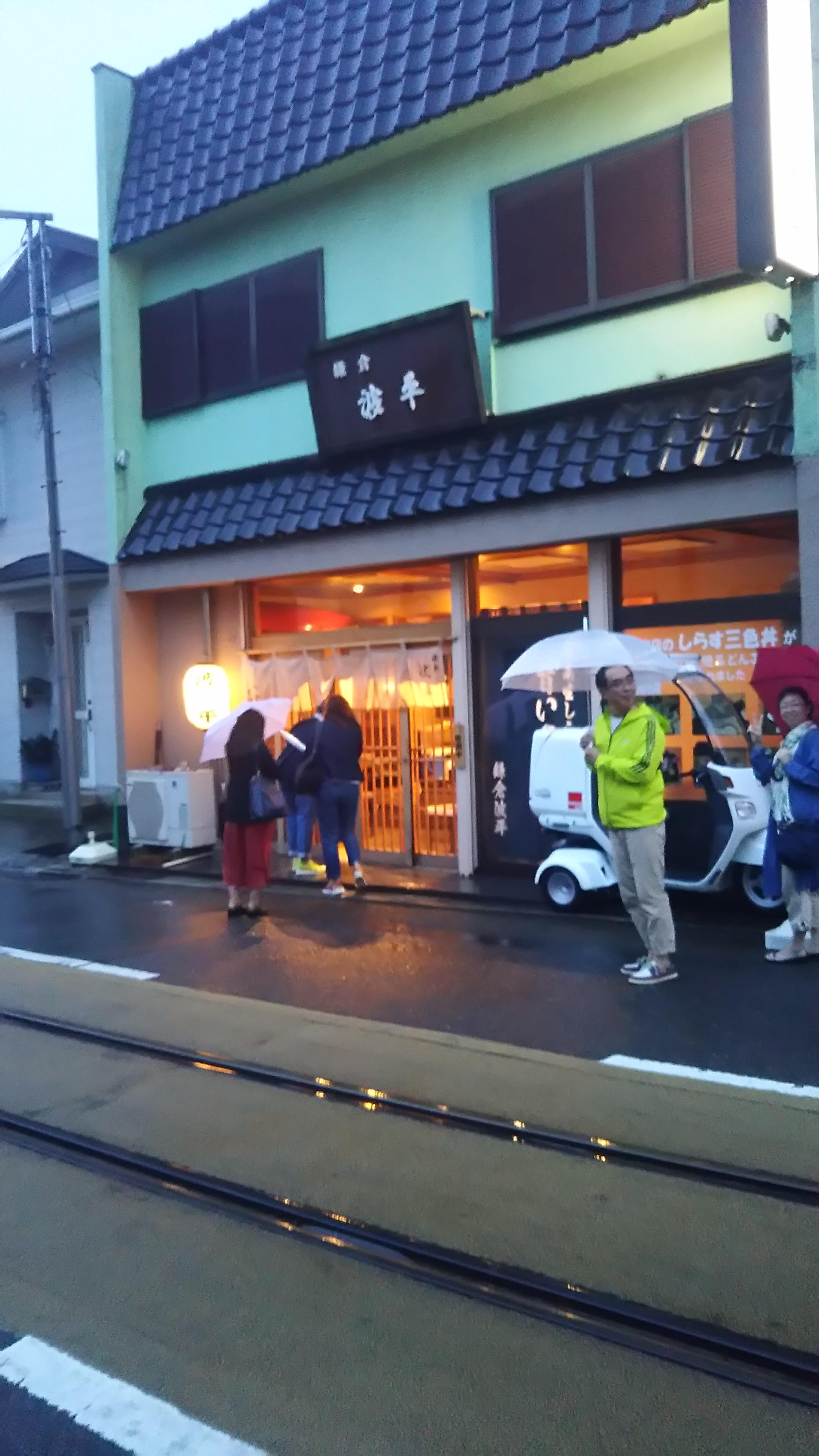 江ノ島駅と腰越駅を結ぶ通りの商店街にこのお店はあります。江ノ電に乗ったことがある方ならご存知かと思いますが、実は、江ノ島駅から次の腰越駅に行く途中には、一般の路上を車と並走しながら電車が走るんです。ですので、私たちが呑んでいる間も、店の真ん前を江ノ電が走るという、貴重な光景を見ることができました。もちろん、地元の方々にとっては当たり前の光景なので、盛り上がっていたのは私だけでした・・(笑)