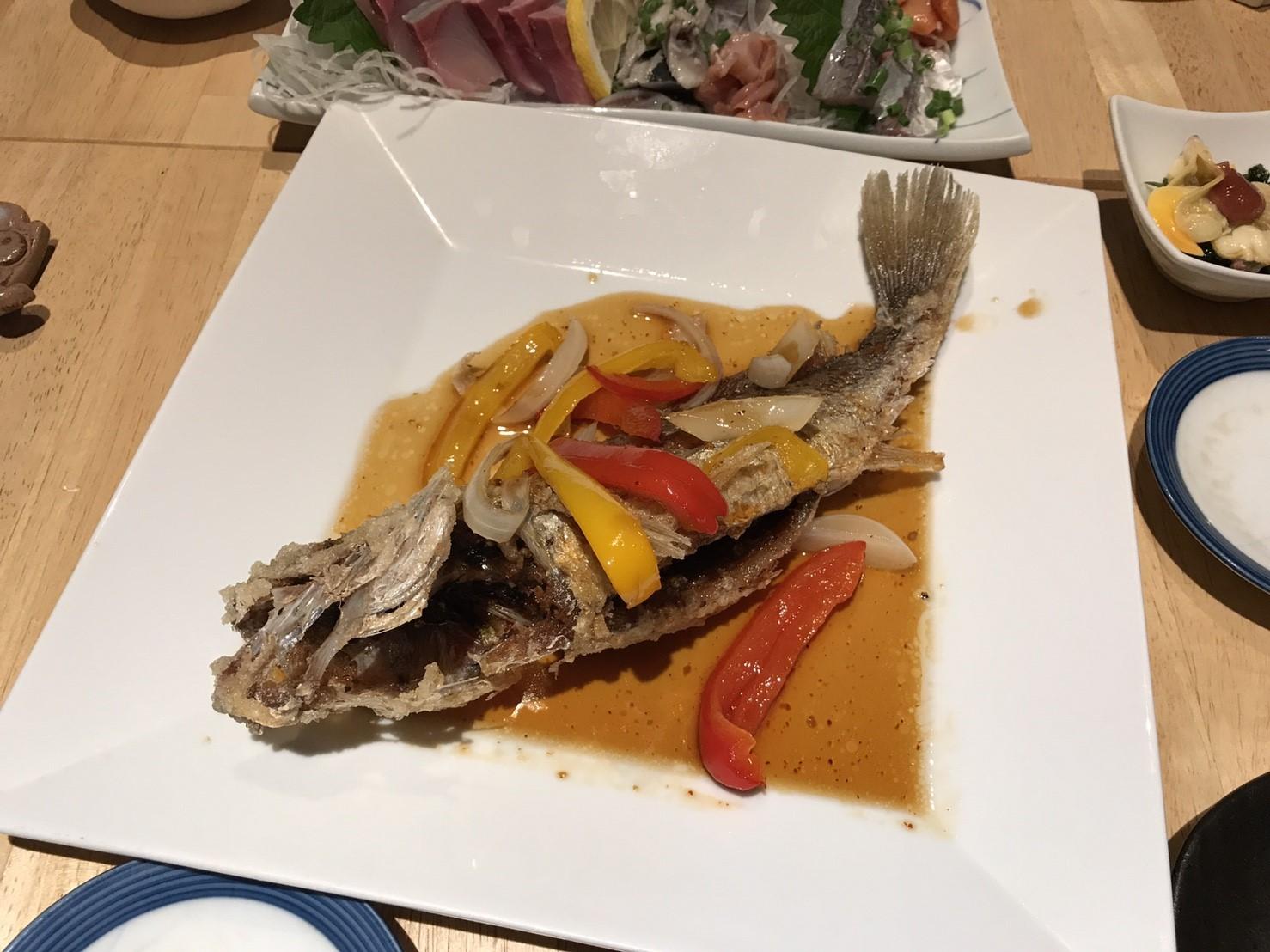 席に着くと同時に、地元でとれた魚料理が続々と運ばれてきました。メインのお造りは、旬の魚を13種類も盛り込んだとってもぜいたくなものでした。そして、地元グルメの『鎌倉おでん』や鎌倉野菜を使った料理が並び、この店の看板料理ともいえる『湘南生しらす』が、山盛りで登場!一口食べると、鮮度の良さがすぐに感じられました。一匹丸ごとの煮魚や素揚げした魚に甘酢の餡をかけたものも絶品で、生魚がちょっと苦手なみどりさんに大好評でした。特に甘酢あんかけのお魚はカリカリに揚がっていて、あのみどりさんが骨まで全部食べていました(笑)