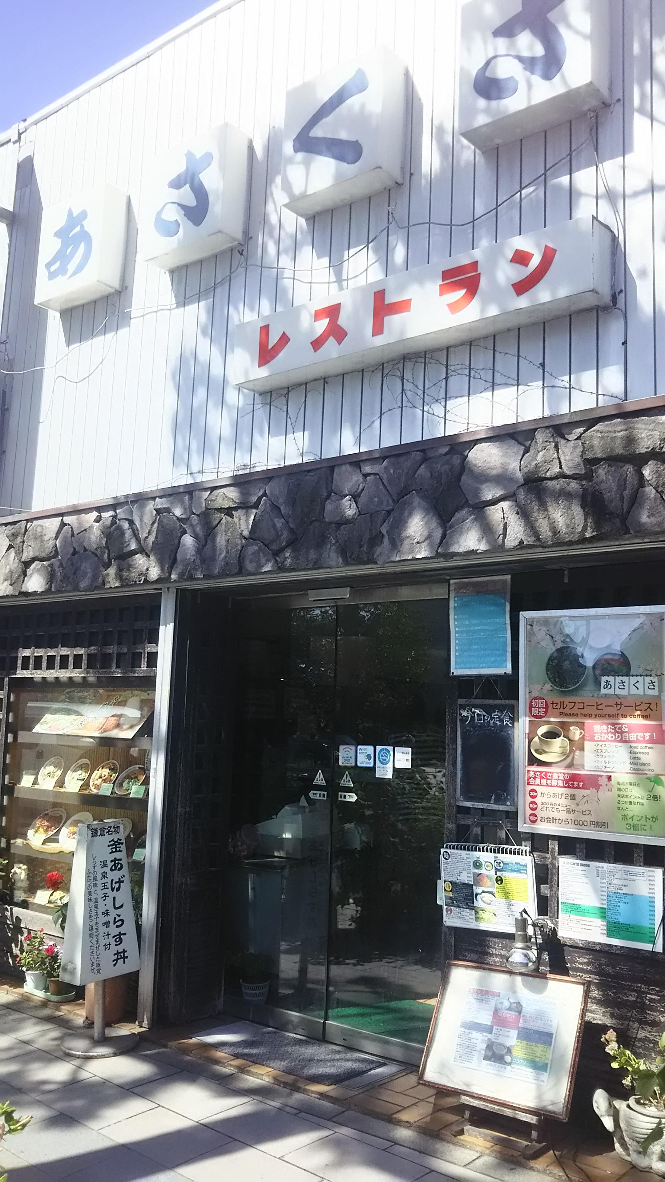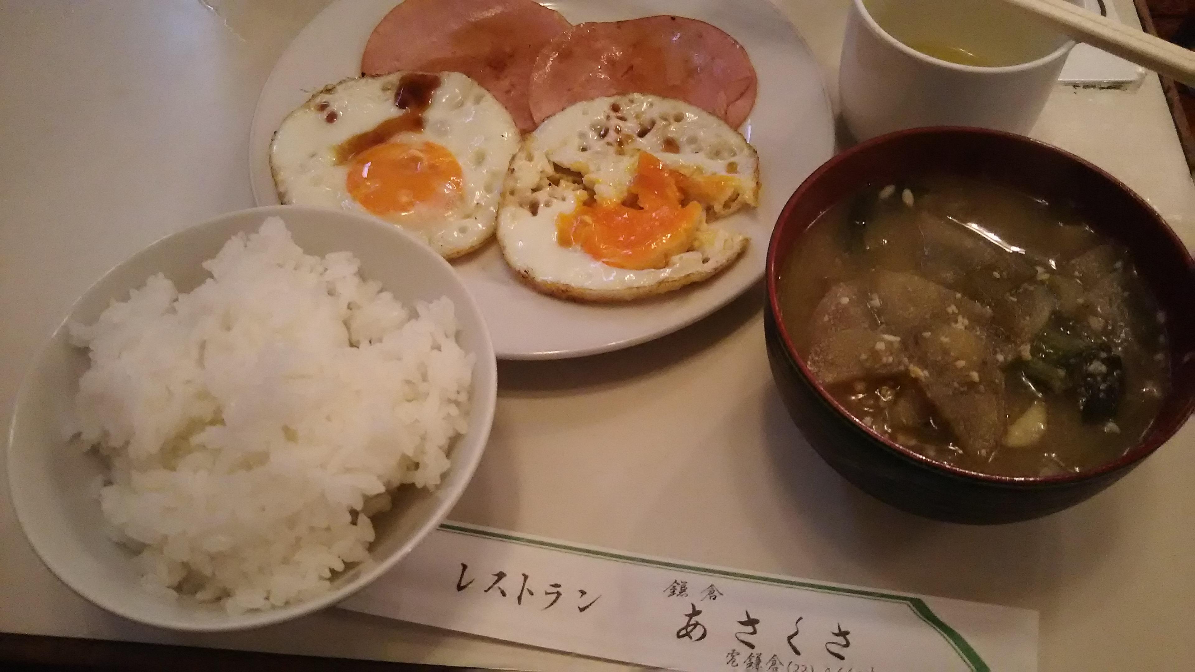 カエルの置物が出迎えてくれた鎌倉駅を出てすぐに、目的地の『レストランあさくさ』に到着。鎌倉なのに、なんで『あさくさ』(笑)と思いつつ店内に入ると、そこは昭和レトロの残るノスタルジックな空間です。元気で気のよさそうな店主が出迎えてくれ、モーニングセットの『ハムエッグ定食』580円を注文。鎌倉野菜を使った具沢山の味噌汁は、とてもおいしかったです。