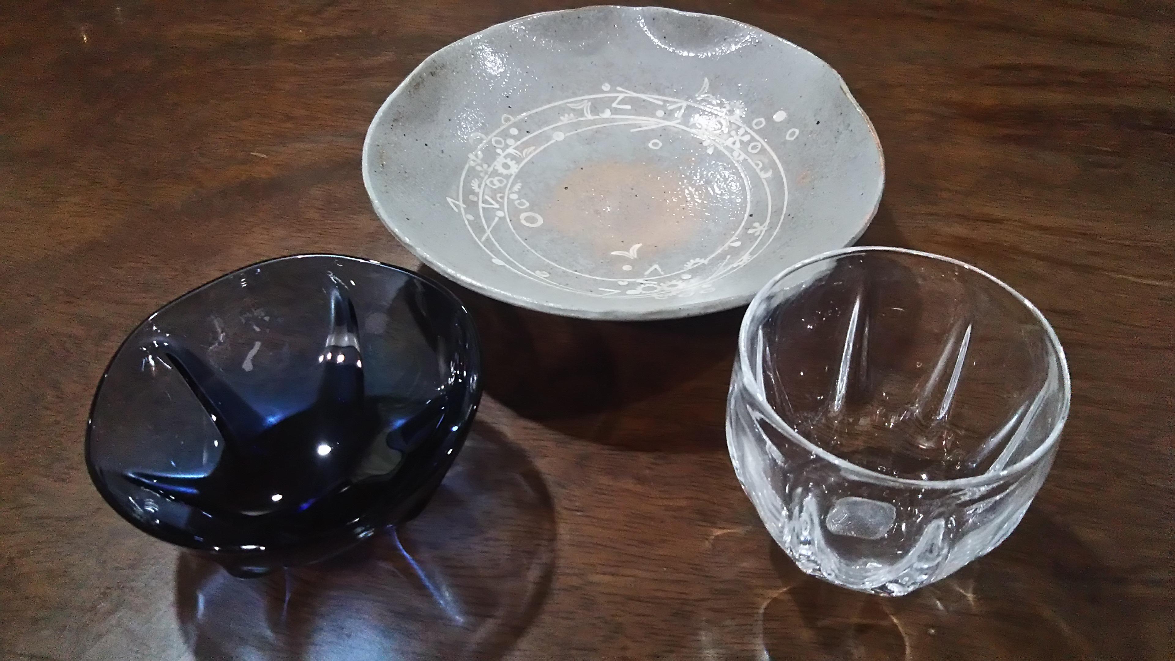 次に、登場回数の多いのが、杉山洋二さんの『手吹きガラス』のグラスや器です。斬新なデザインの猪口もありますが、今年の夏は少し大ぶりのロックグラスが、ハイボールやオンザロックを飲むときに大活躍してくれました。少し平たい器は、冷ややっこや漬物などを盛る時にとても便利で、その涼しげな色合いもとても気に入っています。これからの季節は、小振りなぐい飲みがたびたび登場してきますので、楽しみにしてください!