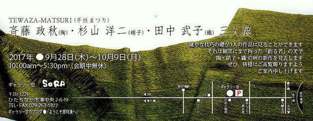 この我が家のお気に入りの二人の作家さんが揃う展覧会が、9月28日木曜日から、ひたちなか市の『ギャラリー空』さんで開催されます。那珂湊駅からお魚市場へ向かう通り沿いにあるこちらのギャラリーは、知識と経験の豊富なオーナーが、優しく丁寧に作品のことや創り手のことを説明してくれるので、どんなものを選んだらよいのか迷われる方でも安心して選ぶことができます。