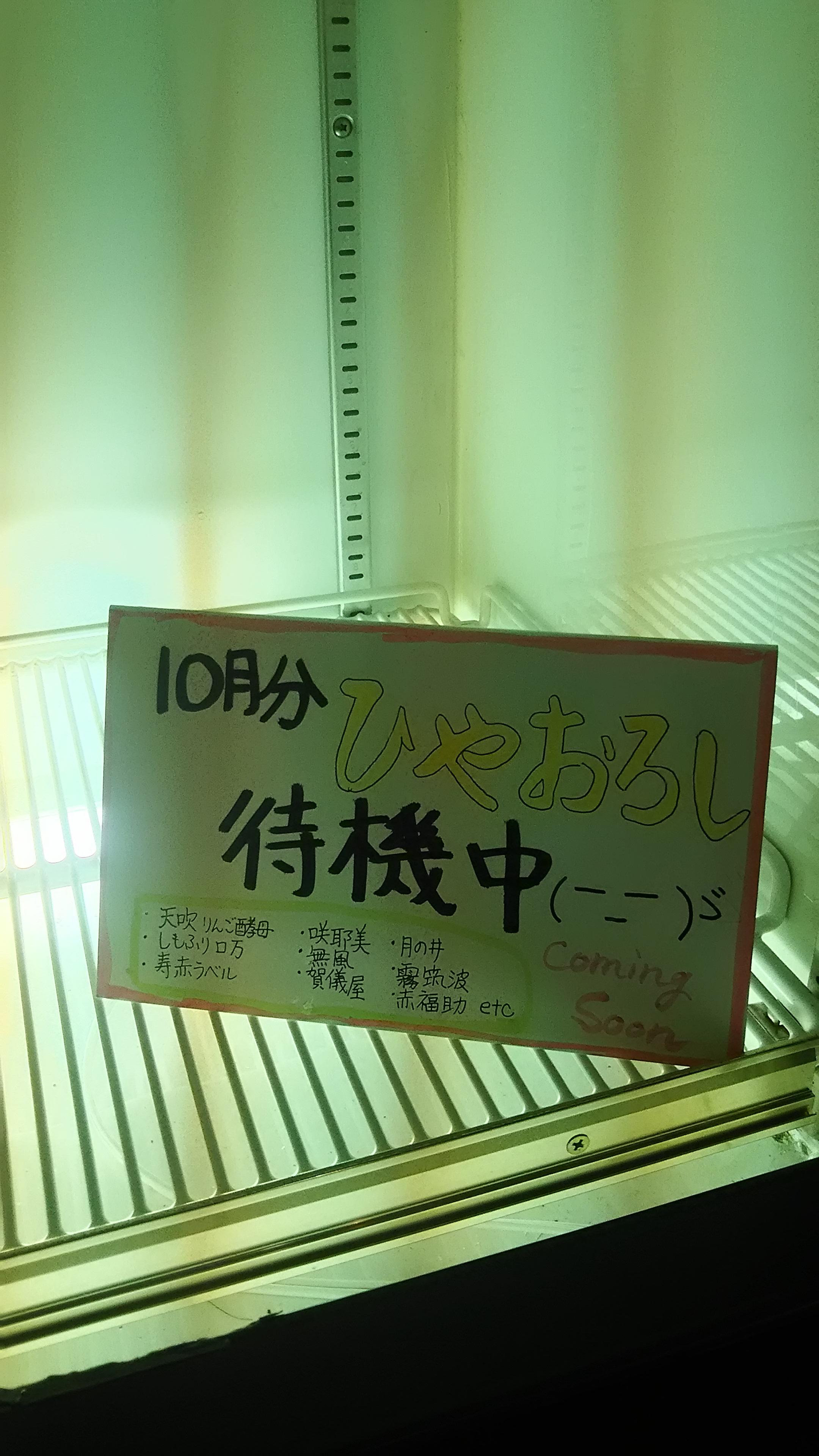 今月も9蔵のひやおろしが入荷してくるので、日本酒冷蔵庫の中には、すでに新入荷用の場所を確保しています。まるで、運動会の場所取りのようですが(笑)、この案内POP、これから、どんなお酒が入荷してくるのか事前に分かるということで、お客様からは好評頂いています~!
