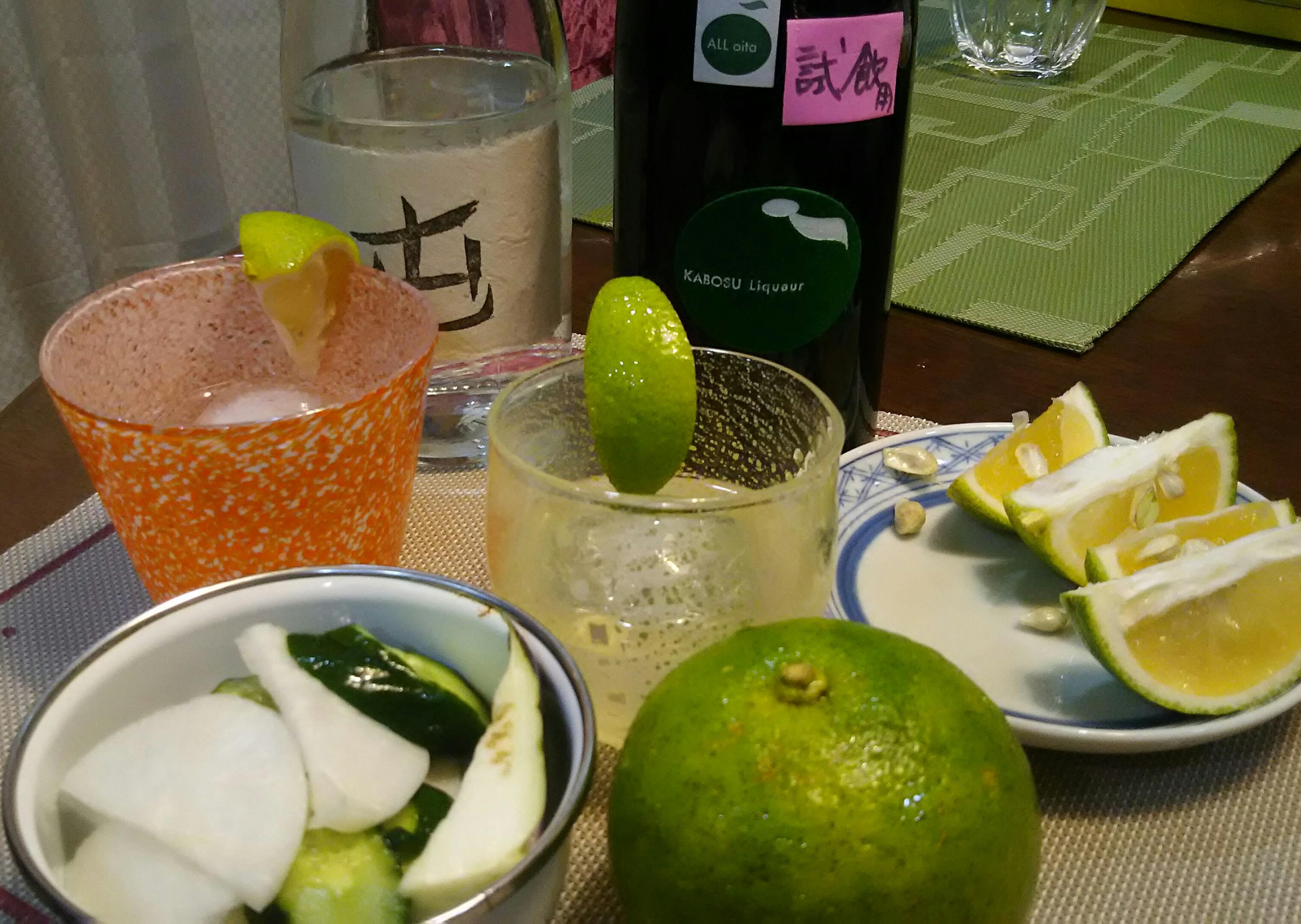 またこの日は、もう一つ新しい飲み方『カボス・オン・カボス』にチャレンジしました!大分県の常徳屋酒造さんの『かぼす酒』にさらにカボスを絞って入れてみました。『追いカツオ』ならぬ『追いカボス』(笑)で、カボス感全開です。常徳屋さんのかぼす酒は、麦焼酎をベースに地元産のカボスを贅沢を使った、ほのかに甘さのある爽やかなお酒です。まずはロックでカボスの香りの爽やかさを楽しんだ後は、炭酸水を入れ、丸氷が融けてなくなるまでカボス割りを楽しみました。