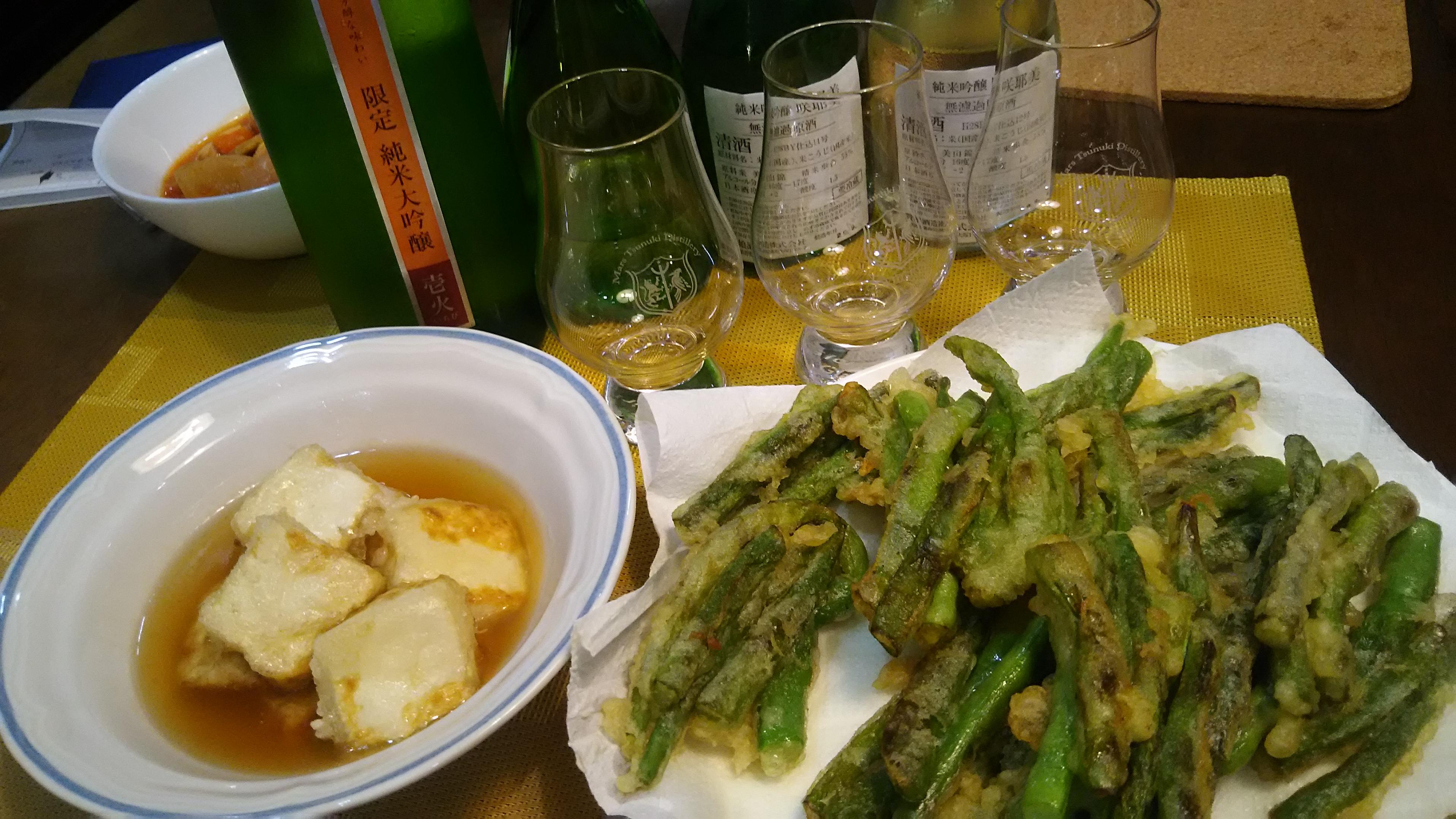 また、この日は急に肌寒くなったこともあって、息子の要望でもあった『揚げ出し豆腐』も合わせていただくことにしました。出汁の利いた少し甘めの餡は、日本酒との相性も良いので、期待が高まります!インゲンのてんぷらは、さっぱりと『タンカン塩』を付けていただくことにしました。