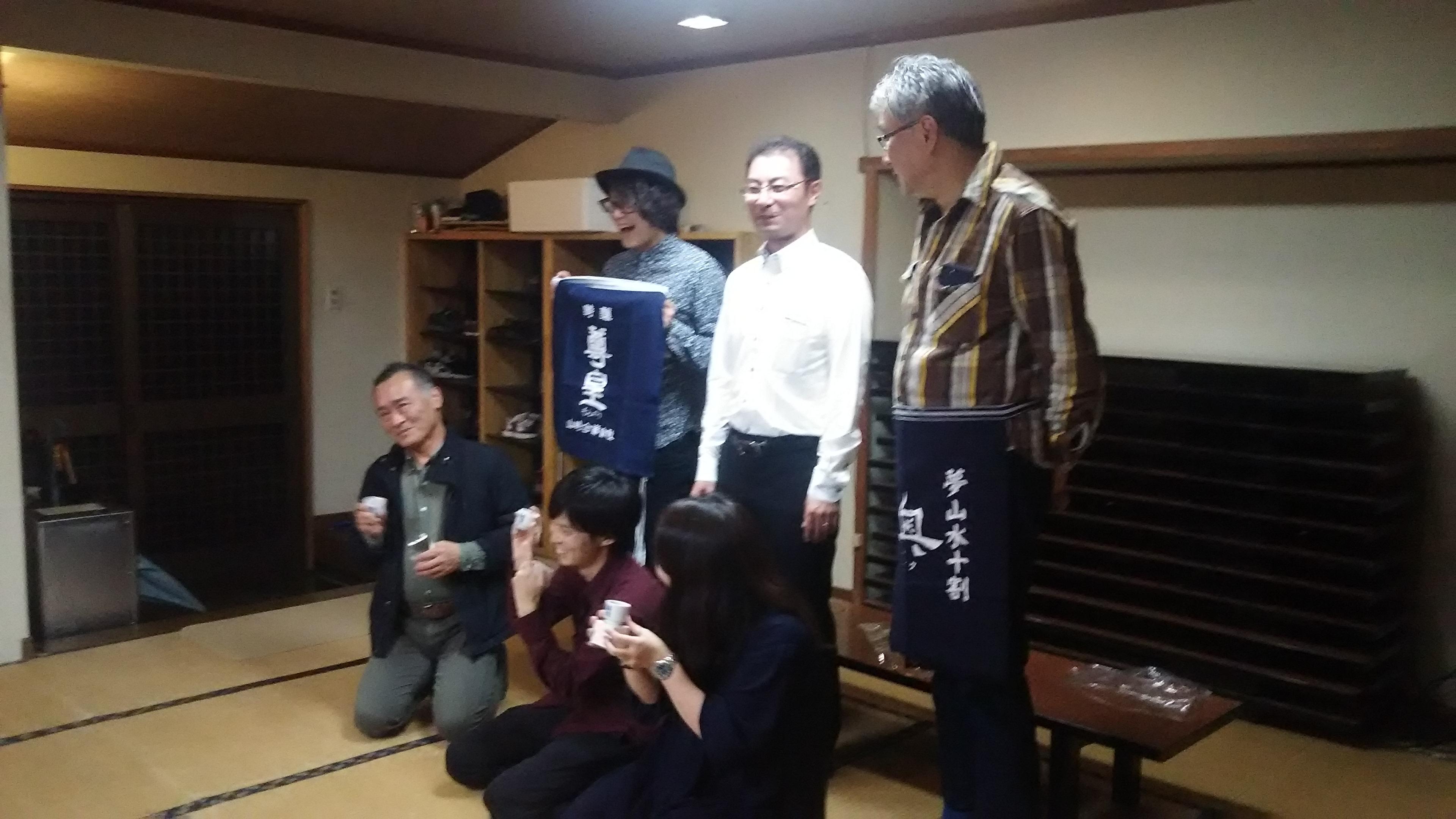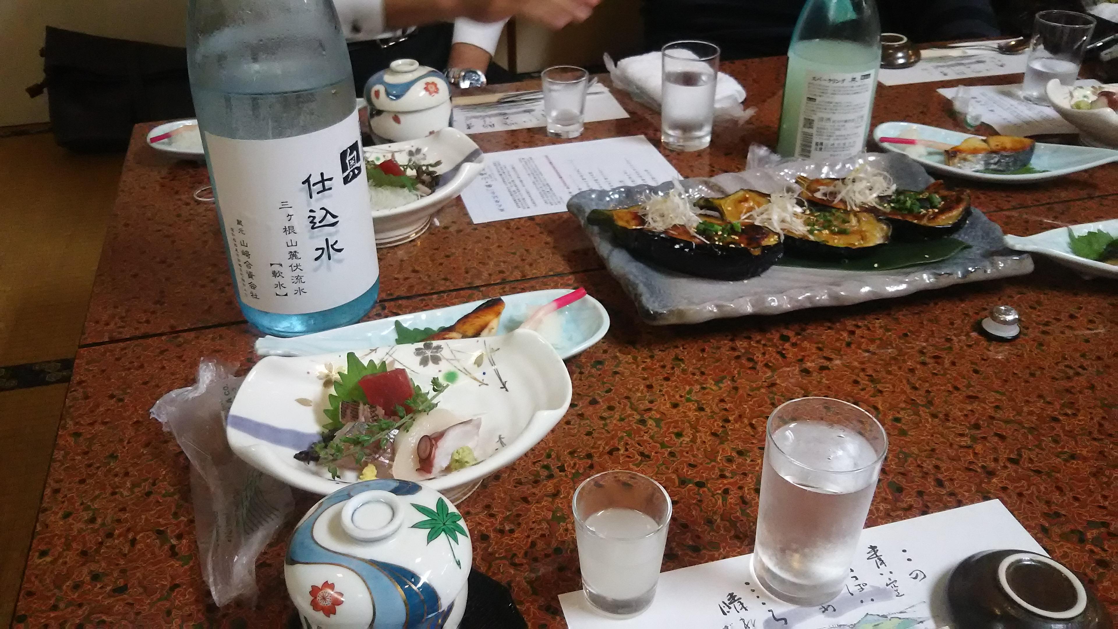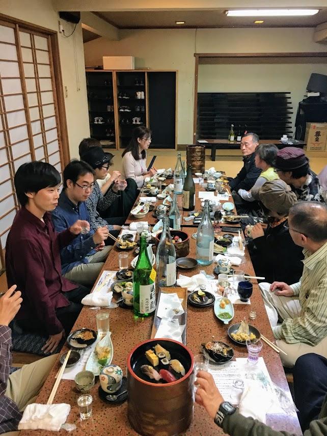 そして、皆さんお待ちかねの新酒鑑評会出品酒『幻々・純米大吟醸』の登場!今まで静かだった会場が一気に盛り上がり、大宴会が始まりました!ちなみに、『幻々』の名前の由来は、『今までにない幻のような味わいのお酒!』ということで名付けられたそうで、本当に幻を見ているかのような夢見心地の美味しさでした。広々とした会場を準備してくださった『緑鮨』さんのお料理は、お造り、焼き魚、茶碗蒸し、田楽、てんぷら、握り寿司、など全部で6種類の手の込んだ逸品が並び、皆さん大満足でした。緑鮨さんのお料理は一段とレベルが上がったように感じました。