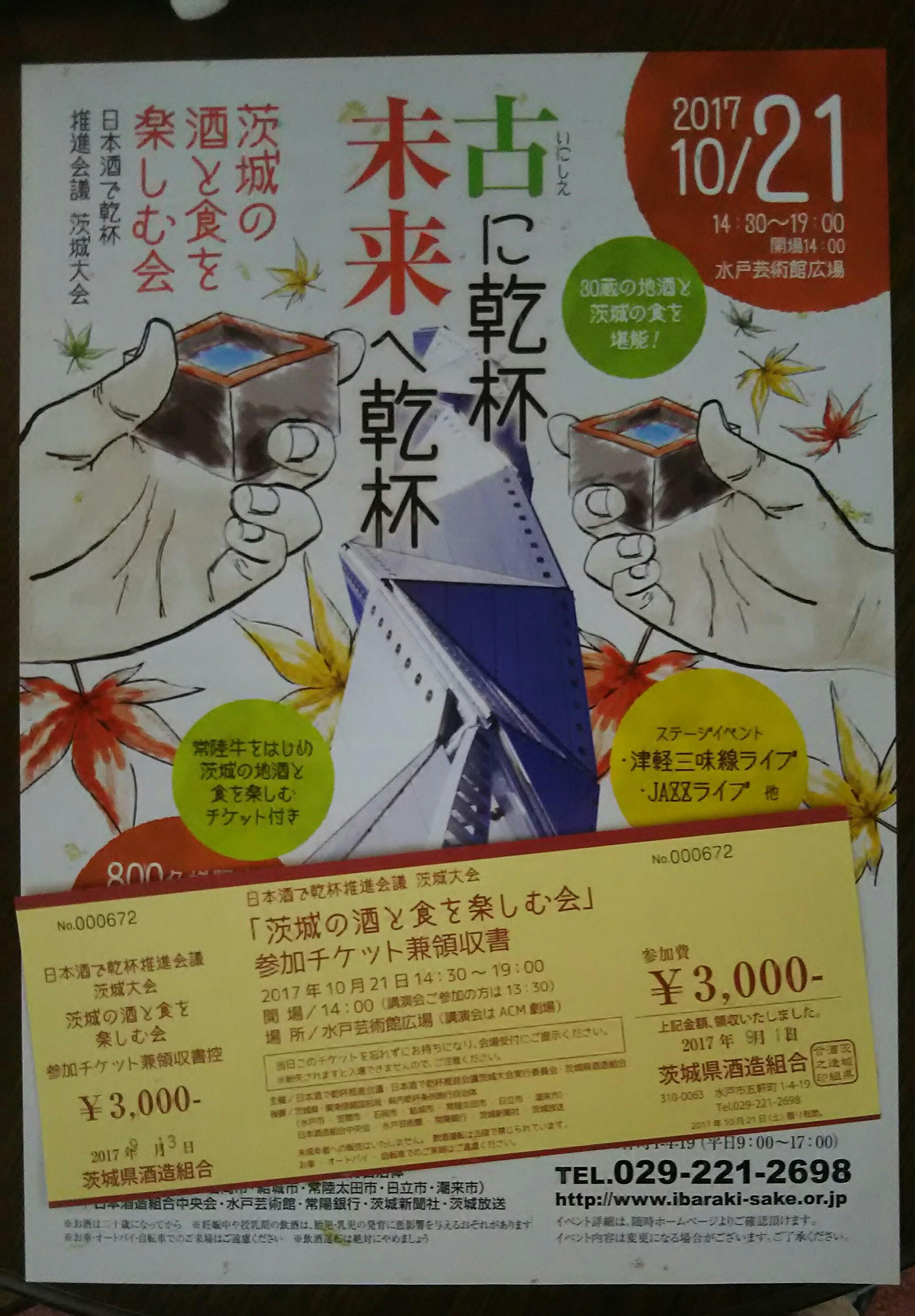 10月もいよいよ後半戦突入、今月もあちこちで様々なイベントが開催されるので、どこに行ったらよいのか?スケジュール管理が大変です!今日も朝から冷たい雨が降っており、今後の台風の影響気になるところですが,今週の土曜日には、水戸の芸術館広場にて『日本酒で乾杯推進会議、茨城大会』が開催されます。