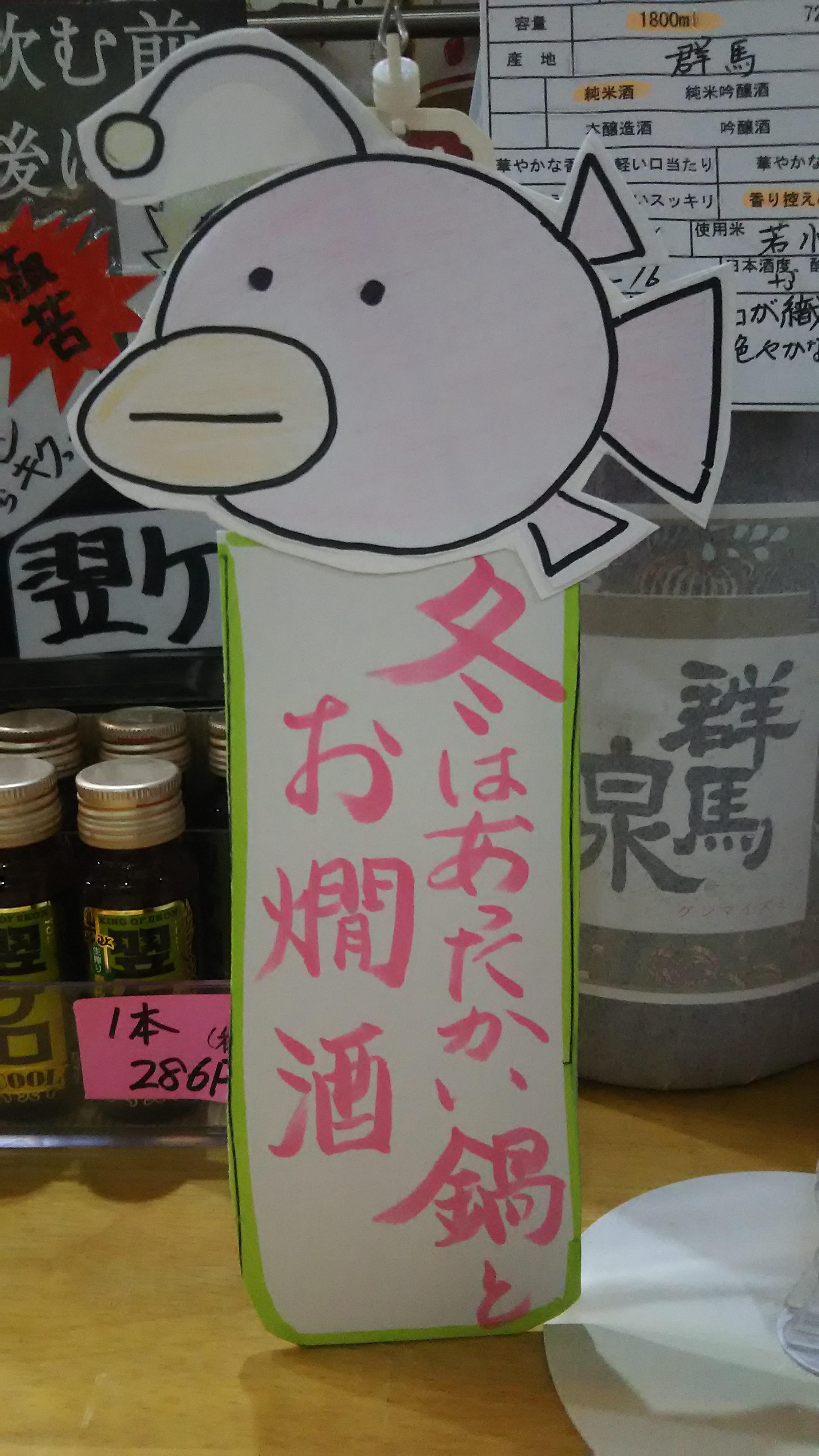 また、特設コーナーの雰囲気を盛り上げるために、40年前のレトロ感たっぷりの徳利とお猪口を並べてみました。そして、茨城の冬の味覚と言えば!コラーゲンたっぷりの『アンコウ』です。その『アンコウ』をイメージしたPOPを作ってみたのですが、このキャラクター、どこかで見たことがあるような・・・?とっても可愛らしく仕上がりましたよ!もちろん、すべて、みどりさんのお手製によるものばかりです。