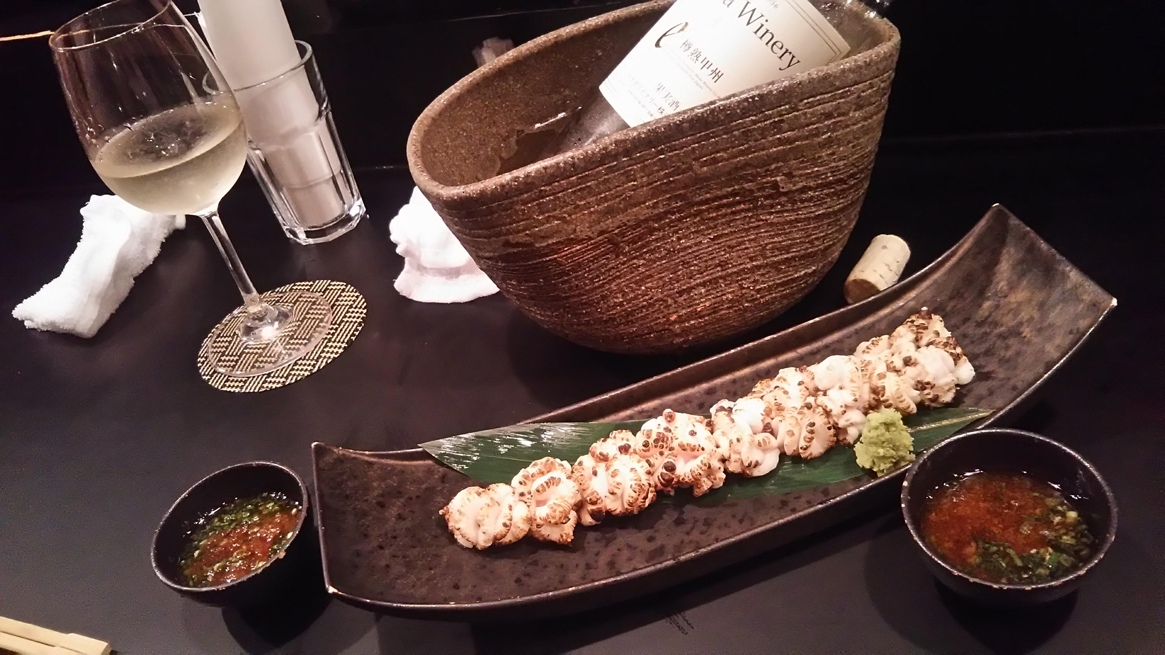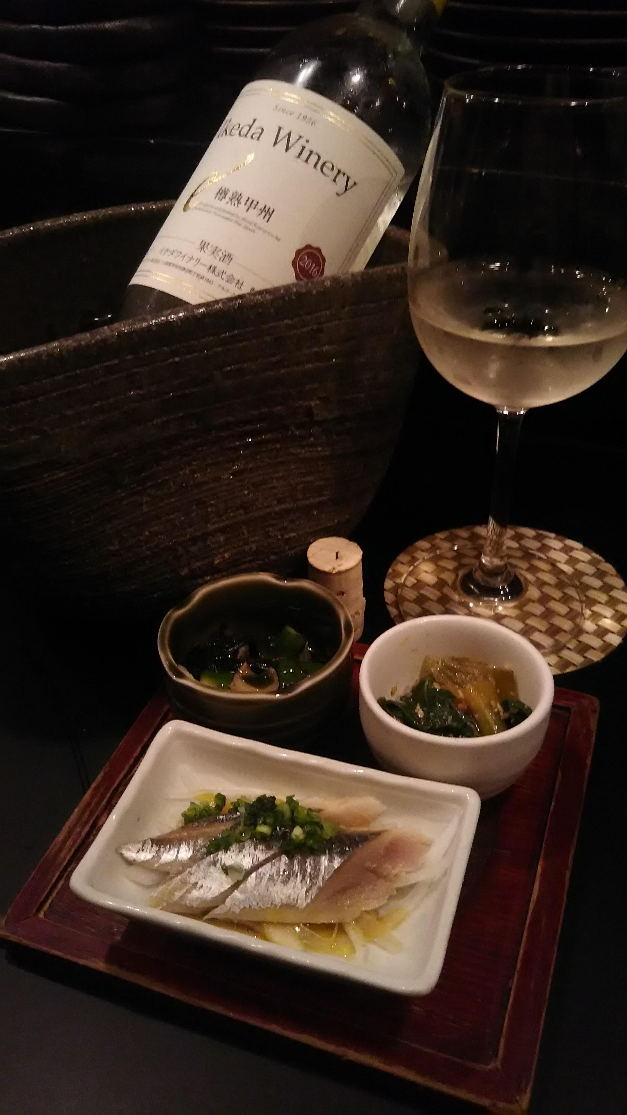 和食との相性が良い山梨県勝沼のイケダワイナリーさんが造る辛口白ワイン『イケダ・樽熟甲州』をいただくことにしました!この日のお通しは、秋刀魚のマリネを含めた旬彩三点盛!!これがまた絶品で、辛口の白ワインとの相性もばっちりです。また、陶製のワインクーラーに入れてくれるサービスも嬉しい心遣いですねぇ~。雨模様で落ち込んでいた気持ちも一気に回復しました(笑)