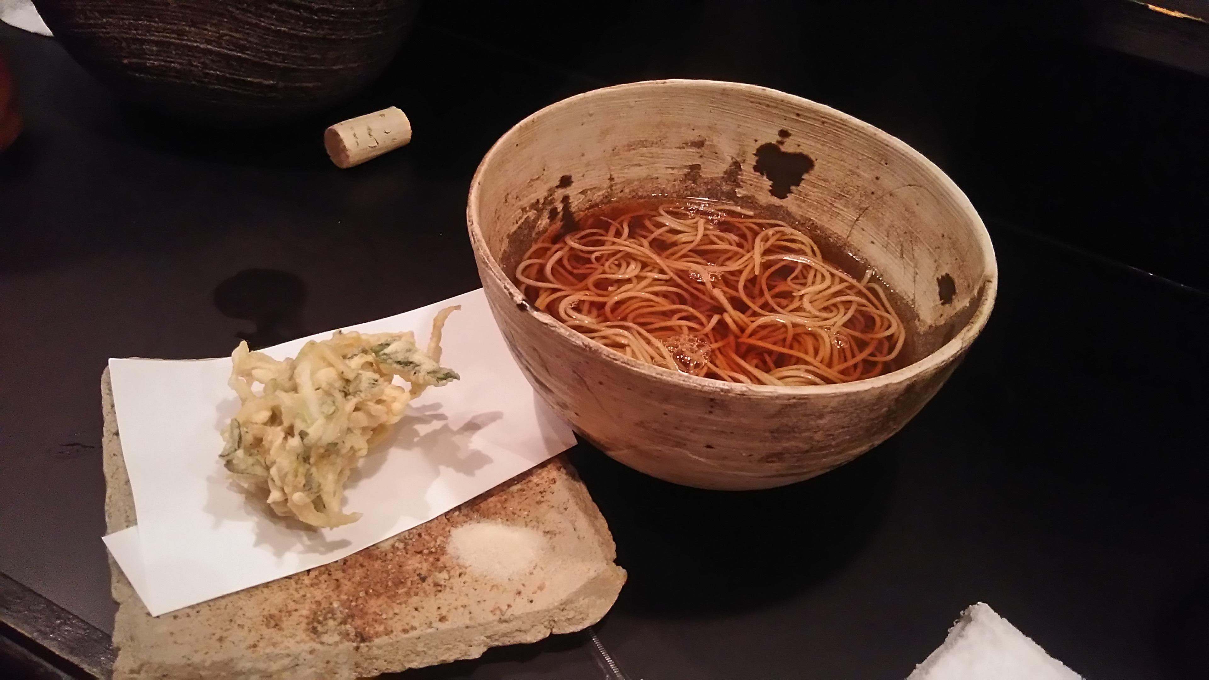 続いて出てきたのが、味のしみた豚の角煮!ボリュームたっぷりの肉厚なんですが、お箸で切れるくらいに柔らかく、口に入れるとホロホロに崩れ、肉の旨味を堪能できました。そして、最後の〆はもちろん蕎麦です。孝之さんは冷たいせいろを、私は温かいかけそばを注文しました。付け合わせには、『白魚と三つ葉のかき揚げ』をお願いして、豪華なてんぷらそばを堪能しました。