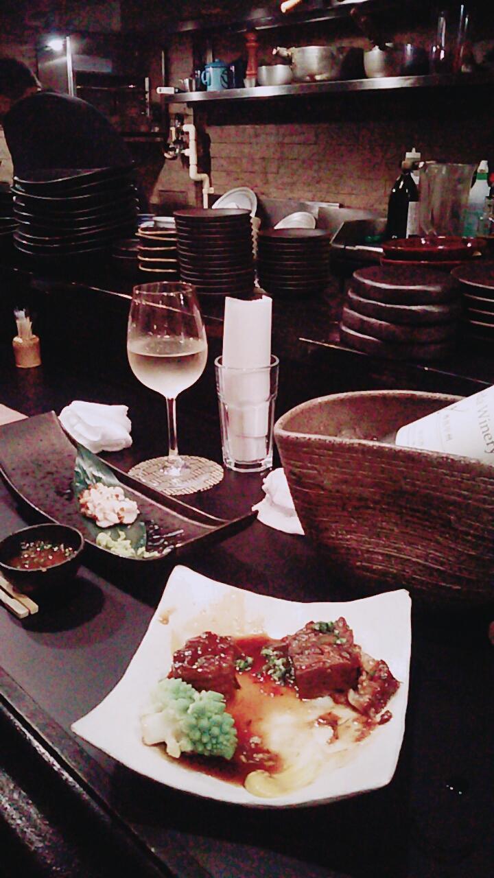 お洒落な玄関を入ると、すぐ目の前に8席のカウンターがあります。2階には広いお座敷もあるのですが、今回はマスターとの会話も楽しめる特等席のカウンター席に座らせていただきました。イベントでビールと日本酒を飲んできたので、みのたけさんではワインを飲みながら旬の料理を楽しむことにしました。