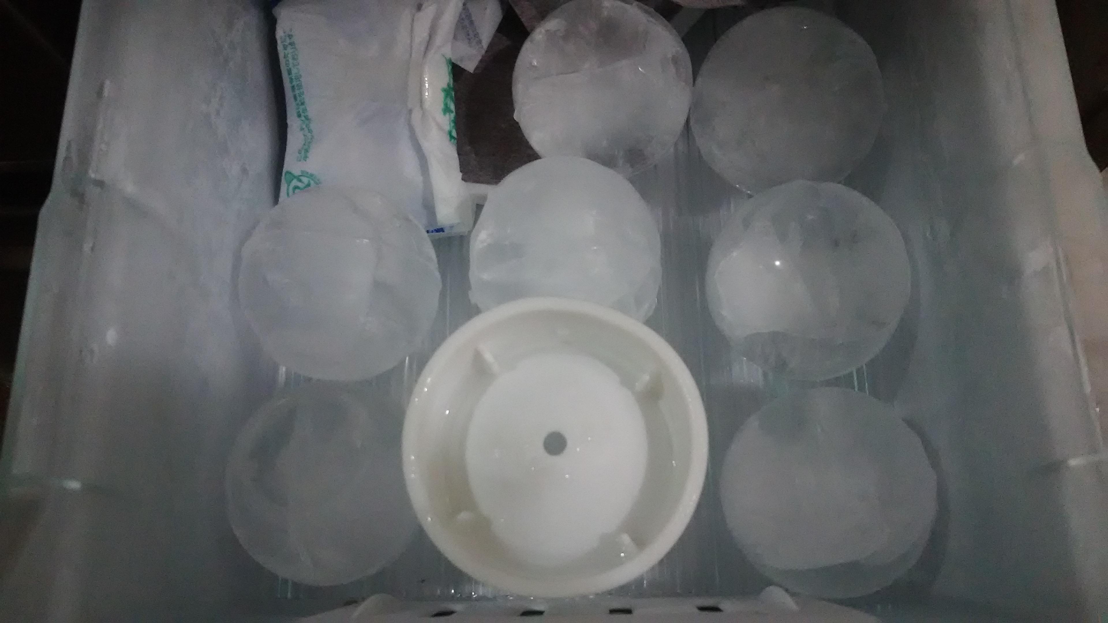 そこで考えたのが、出来上がった丸氷を冷凍庫の中で再冷凍させるという事です。そうすることで、氷がさらに引き締まり、割れにくく、溶けにくい、強い丸氷に生まれ変わります。また、再冷凍させた『丸氷』を使う際には、必ず水洗いをしてください!氷の表面を水で洗うことで、冷凍臭がなくなり、光り輝く丸氷が顔を出してくれます。