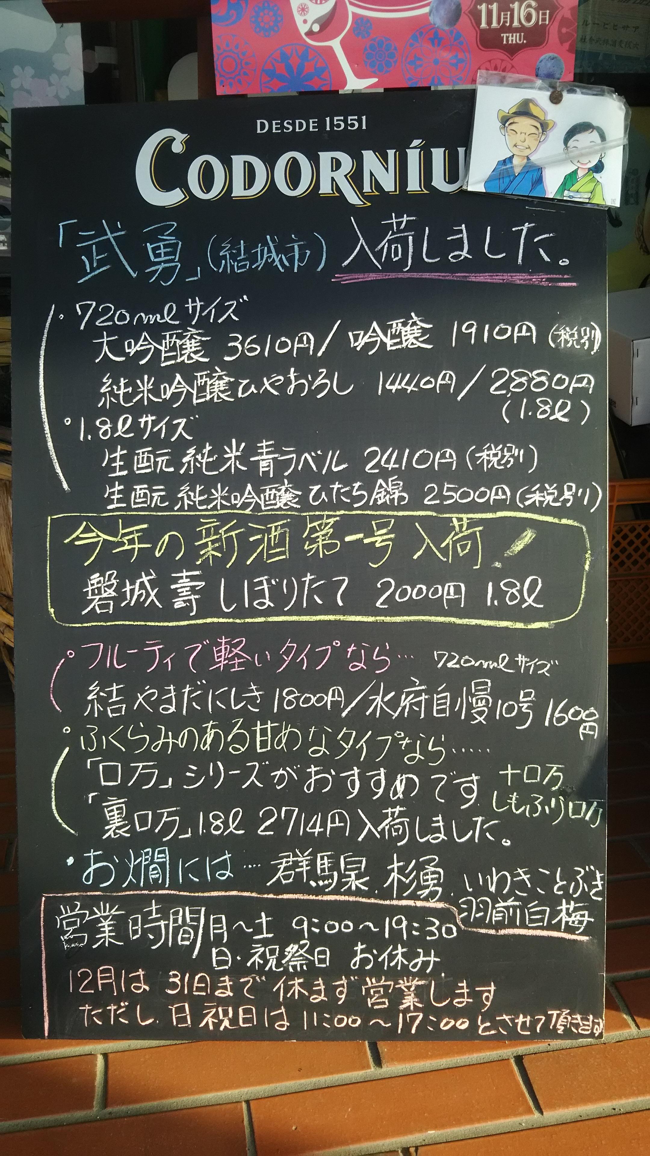 そこで、さっそく店頭の黒板もリニューアルして『しぼりたて新酒』の入荷案内を書き加えてみました!当店の今年一番乗りのしぼりたて新酒は、昨年と同じ、山形県の鈴木酒造さんが造る『磐城壽・しぼりたて』です。うっすらと滓の絡んだうす濁りタイプのお酒で、さらりとした口当たりと、後口の切れの良い、新酒らしさが感じられる一本です。