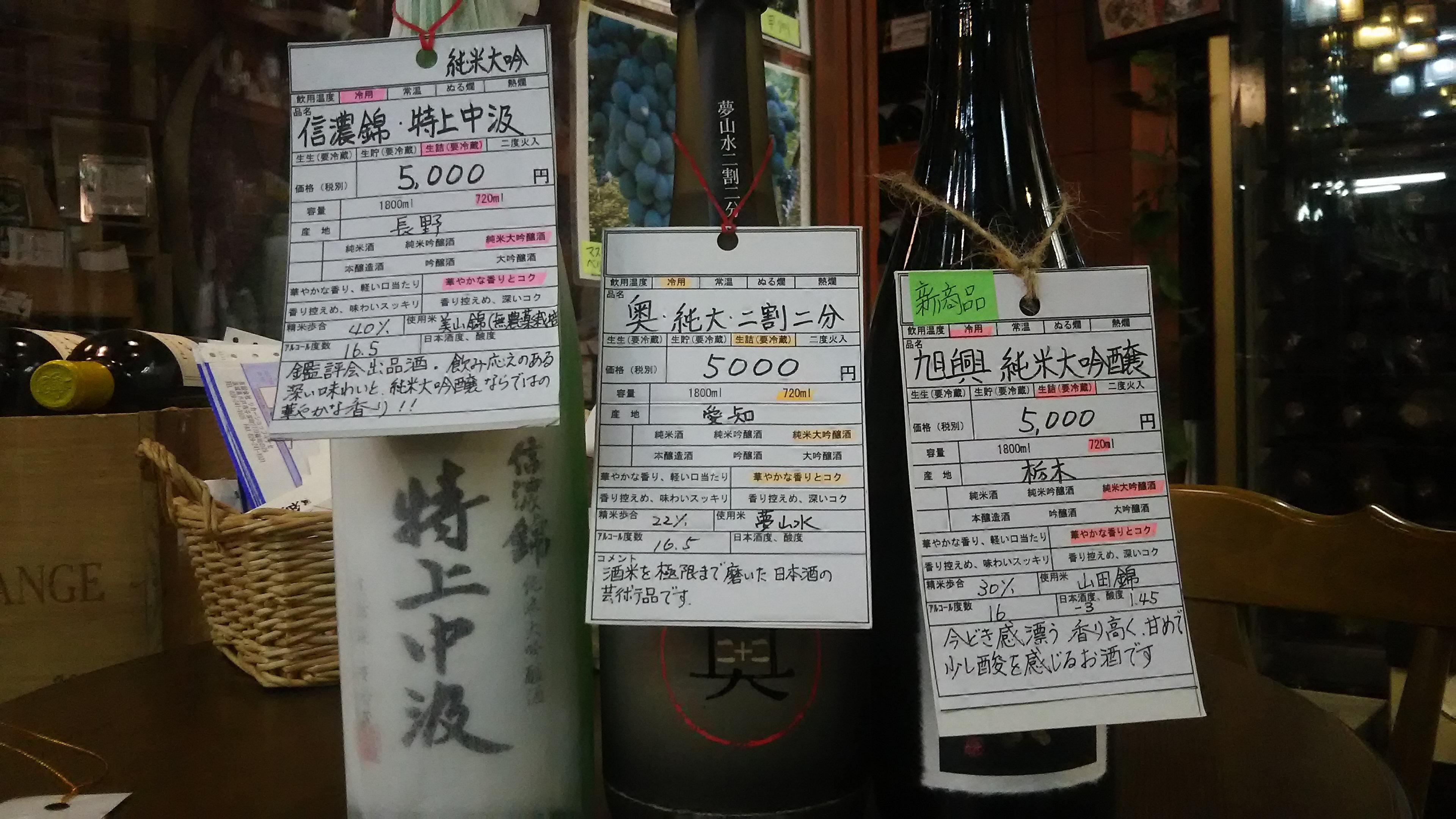 一例を紹介させて頂きますと、愛知県の山﨑合資会社さんの『奥・純米大吟醸』は、幻の酒米『夢山水』を22%まで磨いて造っており、栃木県の渡邊酒造さんの『旭興・純米大吟醸』は、酒米の王様と言われる『山田錦』を30%まで磨いて造りました。また、長野県の信濃錦さんからは、無農薬栽培の『美山錦』を40%まで磨いた純米大吟醸『信濃錦・特上中汲』といった、極上の逸品が入荷してきています。!