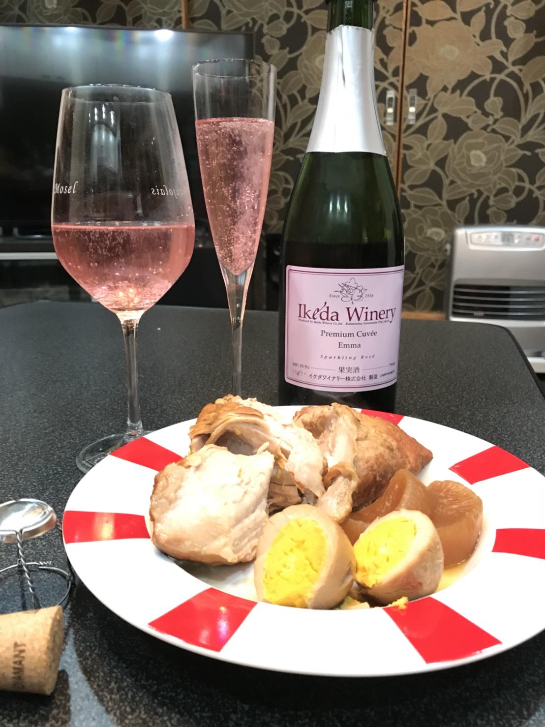 見た目を裏切らないほのかな甘さと、後口のキレの良さがあり、この日の献立の甘くコクのある煮豚や大根、煮卵との相性も良く、あっという間に3人で1本を飲んでしまいました(笑)非常に完成度の高いスパークリングワインだと感じました。年末年始の宴席に