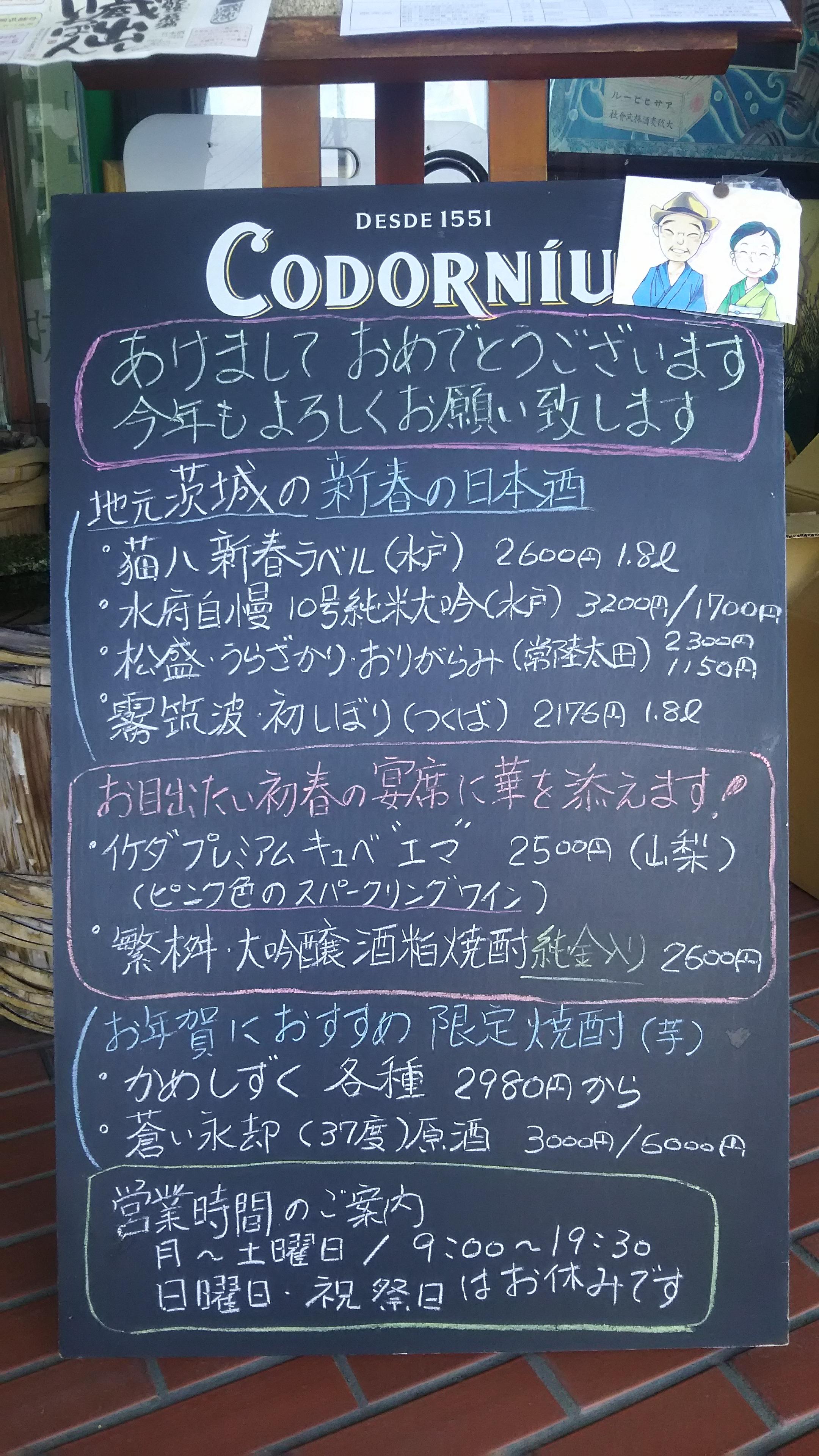 新年の初営業に合わせて、店頭の黒板も新春バージョンに書き直しましたので、ご紹介したいと思います!今回のテーマは『新春にお勧めのお酒』です。今日から仕事始めの方も多いと思いますが、今週いっぱいお休みの方も多いでしょうか。今日はそんなお休み中の方や帰省中の方、仕事関係のお年賀の贈答品を買い求める方々にご来店いただいています。
