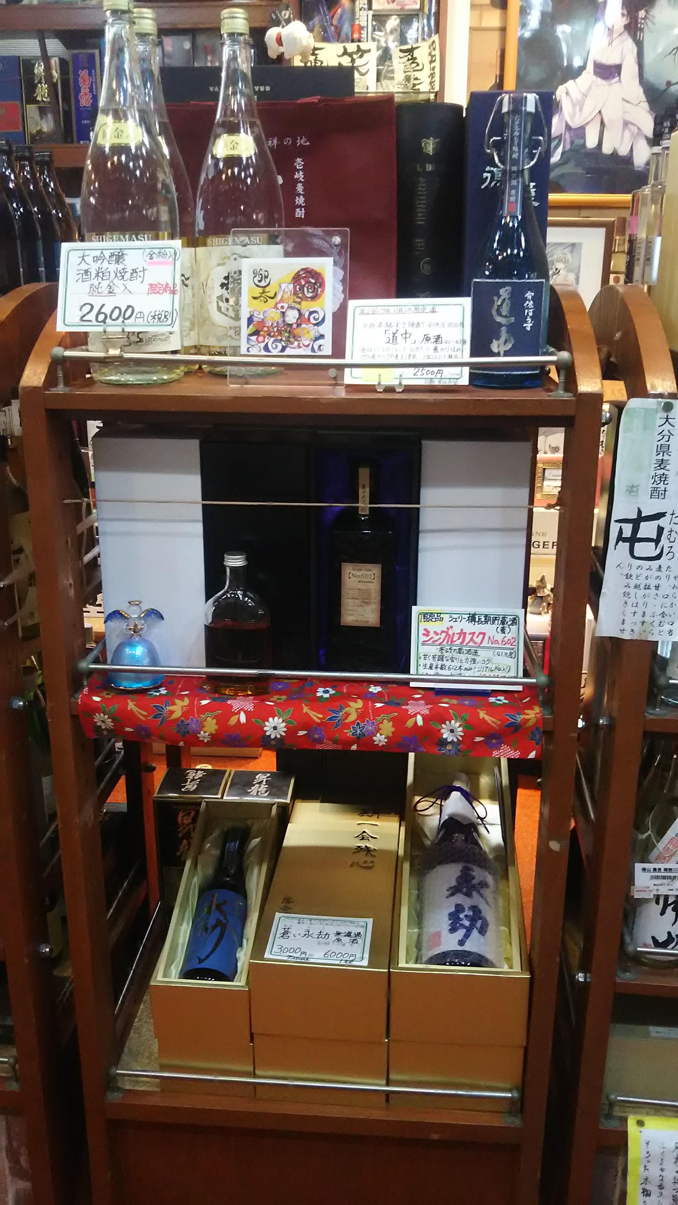 焼酎は棚の最上部におすすめのものを蔵元別に並べました!また、レジ前の棚にゴチャッと置いていた『和リキュール』を、焼酎棚の背後にあるリキュール類の上部に移動して、全ての商品が一目で分かるように並べました。そして、今回の目的でもあった新しい商品棚には、今の時期お勧めの数量限定の逸品を並べてみました。『特別感』が感じられるような陳列を目指したのですが、うまく伝わりますかねぇ(笑)