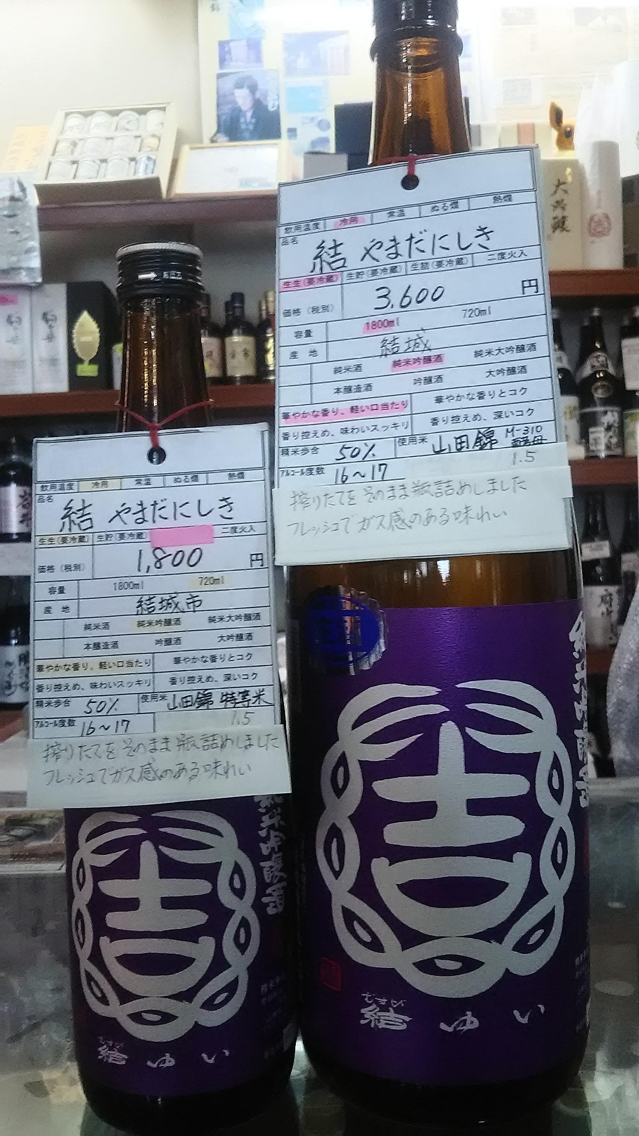 さて、今宵もつ煮に合わせて飲むお酒は、結城市の結城酒造さんの『結』の新酒2銘柄、紫のラベルの『結・純米吟醸生・山田錦』と『富久福・特別純米生原酒・五百万石』です。