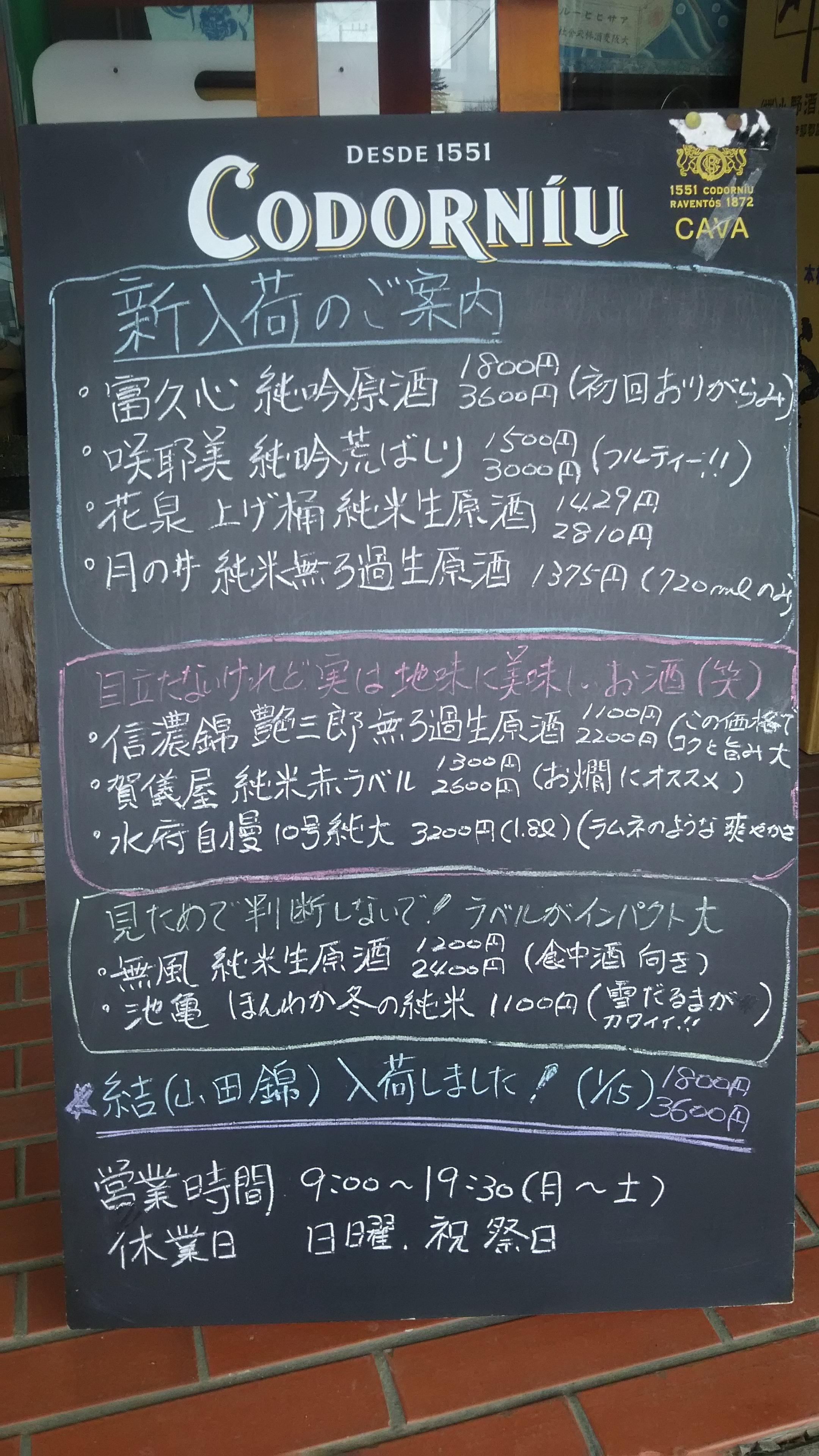 特にこれからの時期は大吟醸クラスのお酒を仕込む蔵元が多いので、寒さは歓迎されるそうですが、実際に作業をする方にとっては辛いですね~。そこで今日は、新年になってから入荷してきているお酒がだいぶ出揃ってきて、店頭の黒板を書き直ししたので、ご紹介したいと思います。