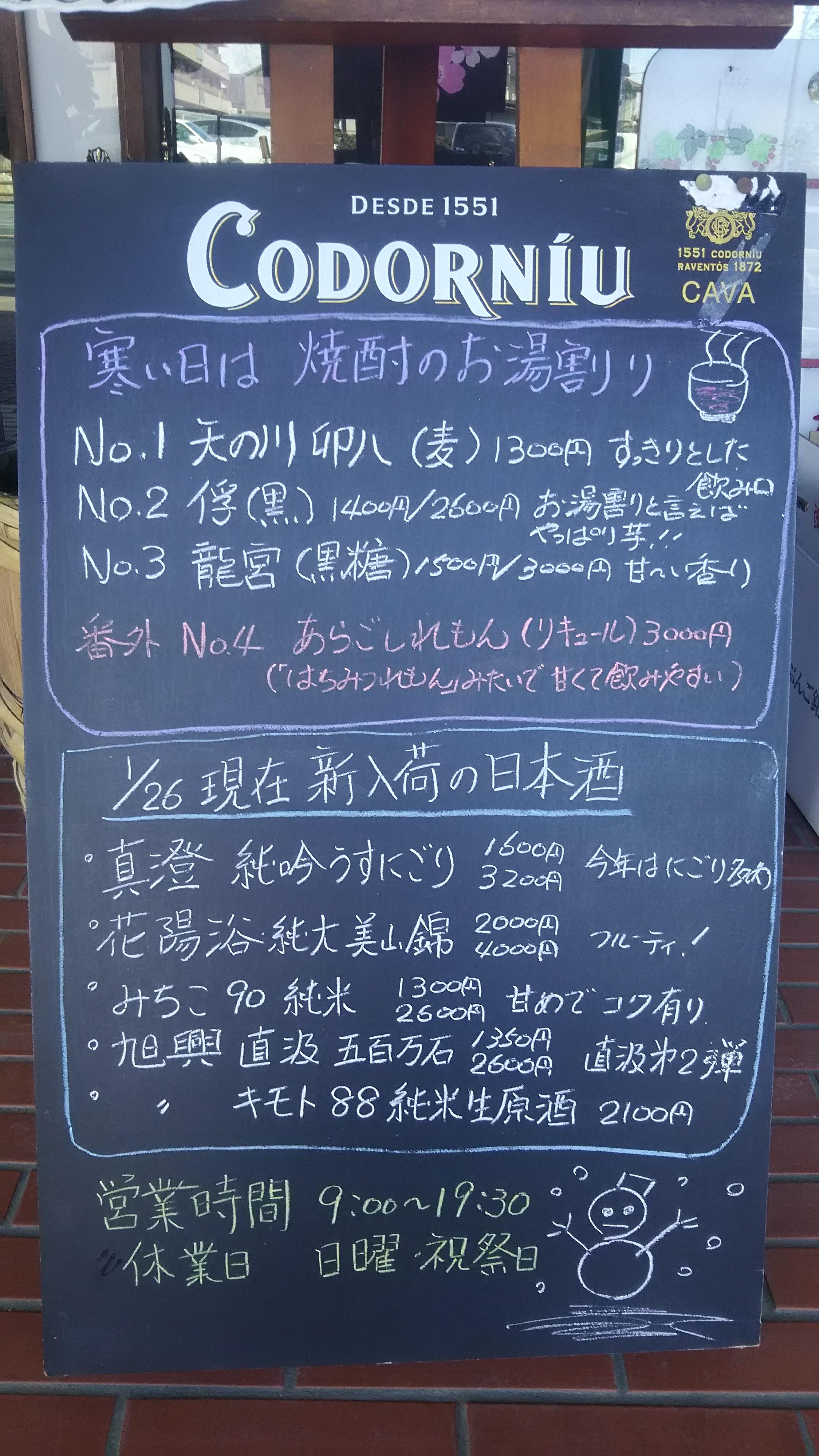 暖房が効かないのは辛いですね。せめてこんな寒い日は、温かいお酒で身体の中から温めましょう!という訳で、店頭の黒板を書き変えてみました。タイトルは『寒い日は焼酎のお湯割り』です。温かいお酒と言うと、日本酒のお燗酒を真っ先に思い浮かべる方も多いかと思いますが、焼酎のお湯割りもいいですよ~。実は私も最近は晩酌に麦焼酎のお湯割りを頂いています。