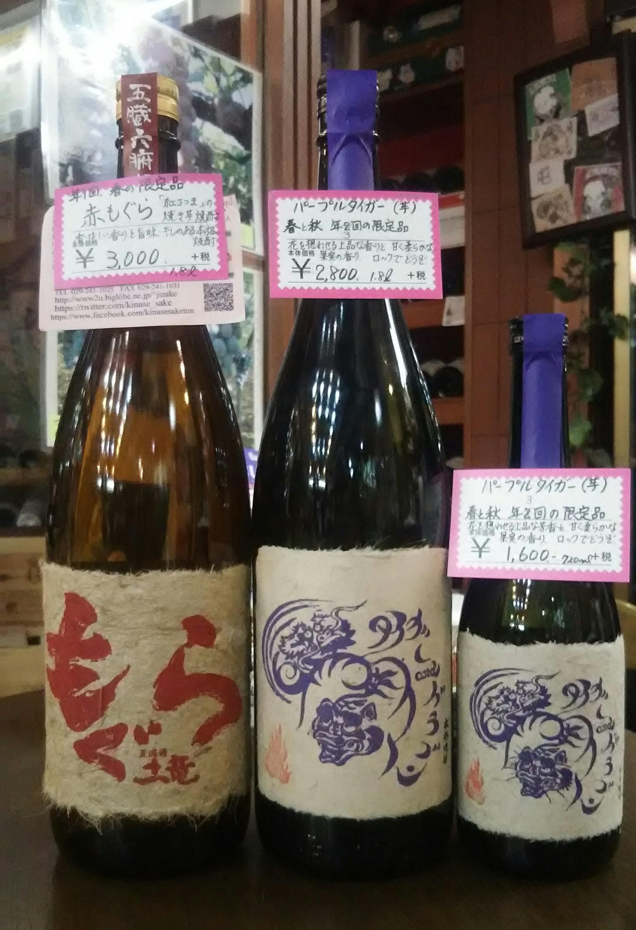 さて、お湯割りと言えば、芋焼酎!芋焼酎は季節商品が日本酒と比べて少ないのですが、今回珍しく二種類が同時に入荷してきました。種子島の四元酒造さんの『パープルタイガー』と鹿児島県のさつま無双さんの『赤もぐら』です。