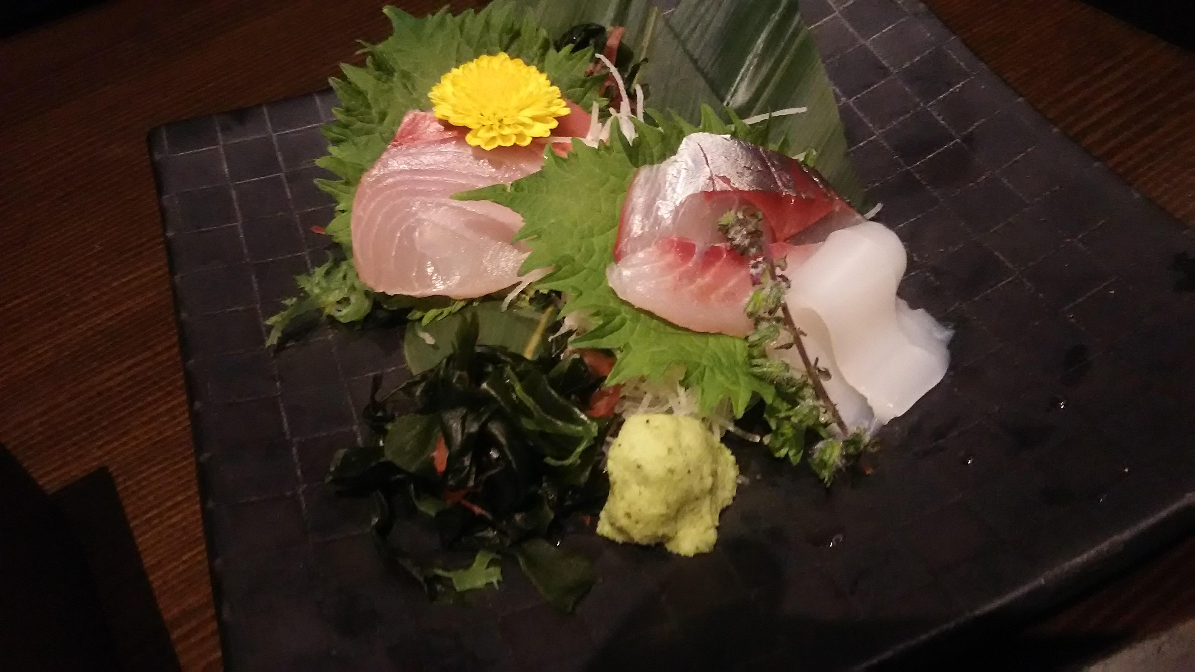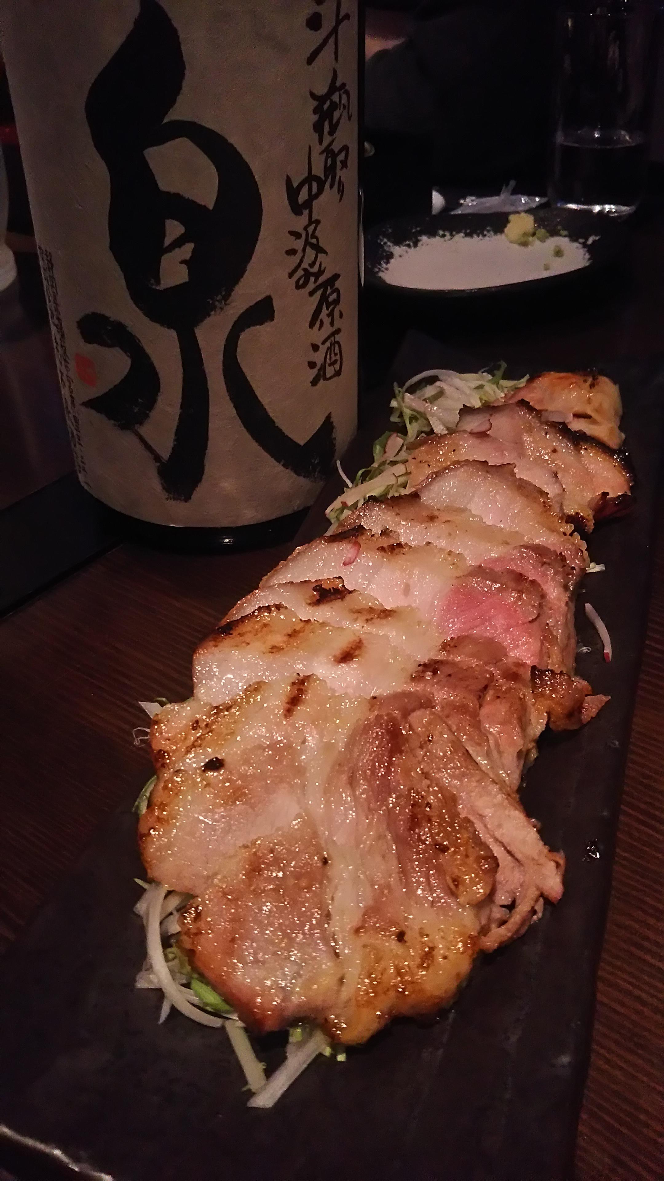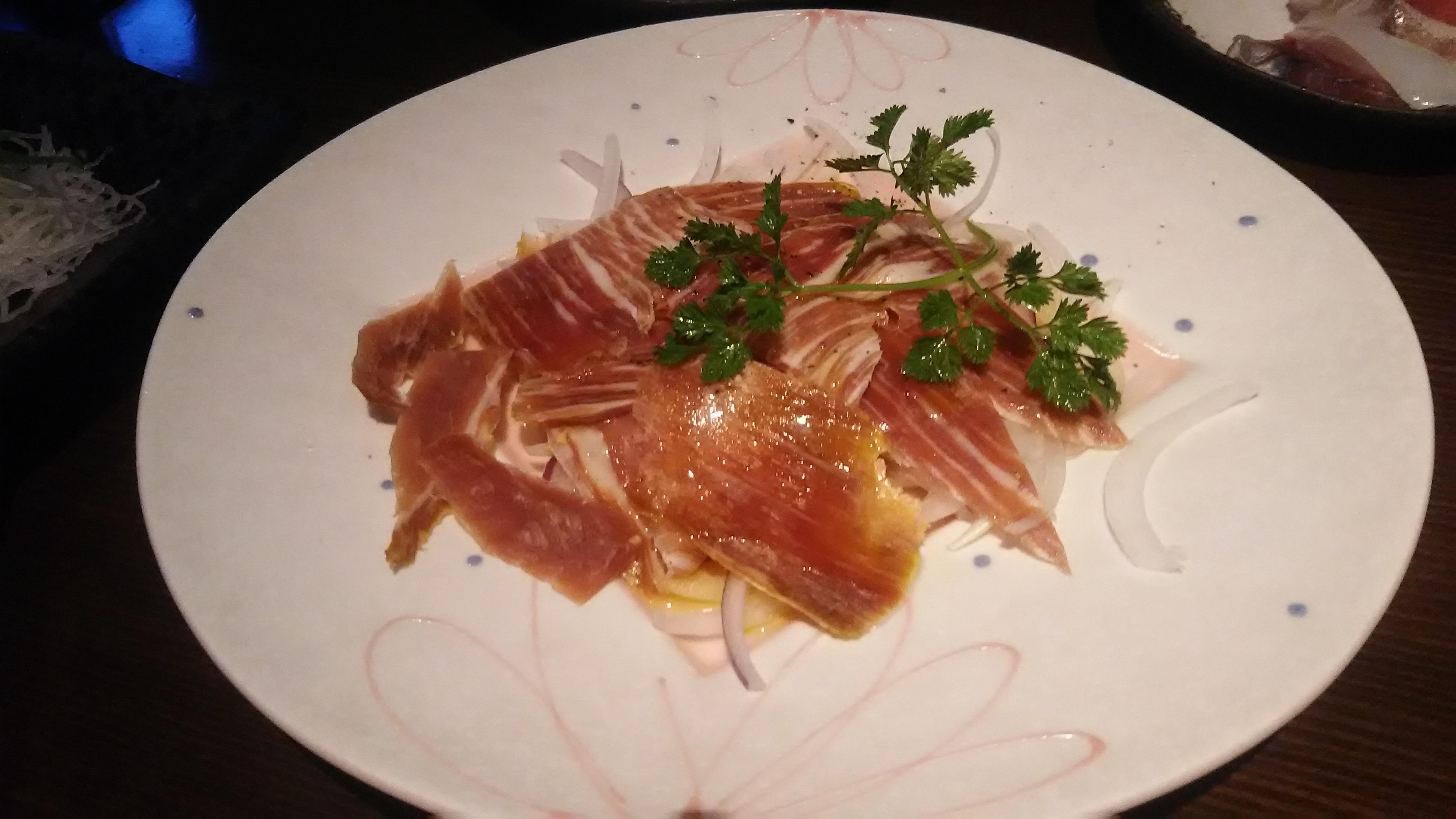 皆さんが至福の一滴に酔いしれている間に、テーブルには様々な料理が所狭しと並べられ、アッと言う間に大宴会モードに突入です。この日のお料理は、梅津店長の粋な計らいで、様々なお酒とのマリアージュを楽しんで頂けるようにと、バラエティに富んだものとなりました!鮮度抜群の刺身や、酒飲みに嬉しい肴三種盛、生ハムに豚の味噌漬け、大エビの炒め物、などなど、どれもとっても美味しくて、お酒を飲むのを忘れてしまうほどでした(笑)