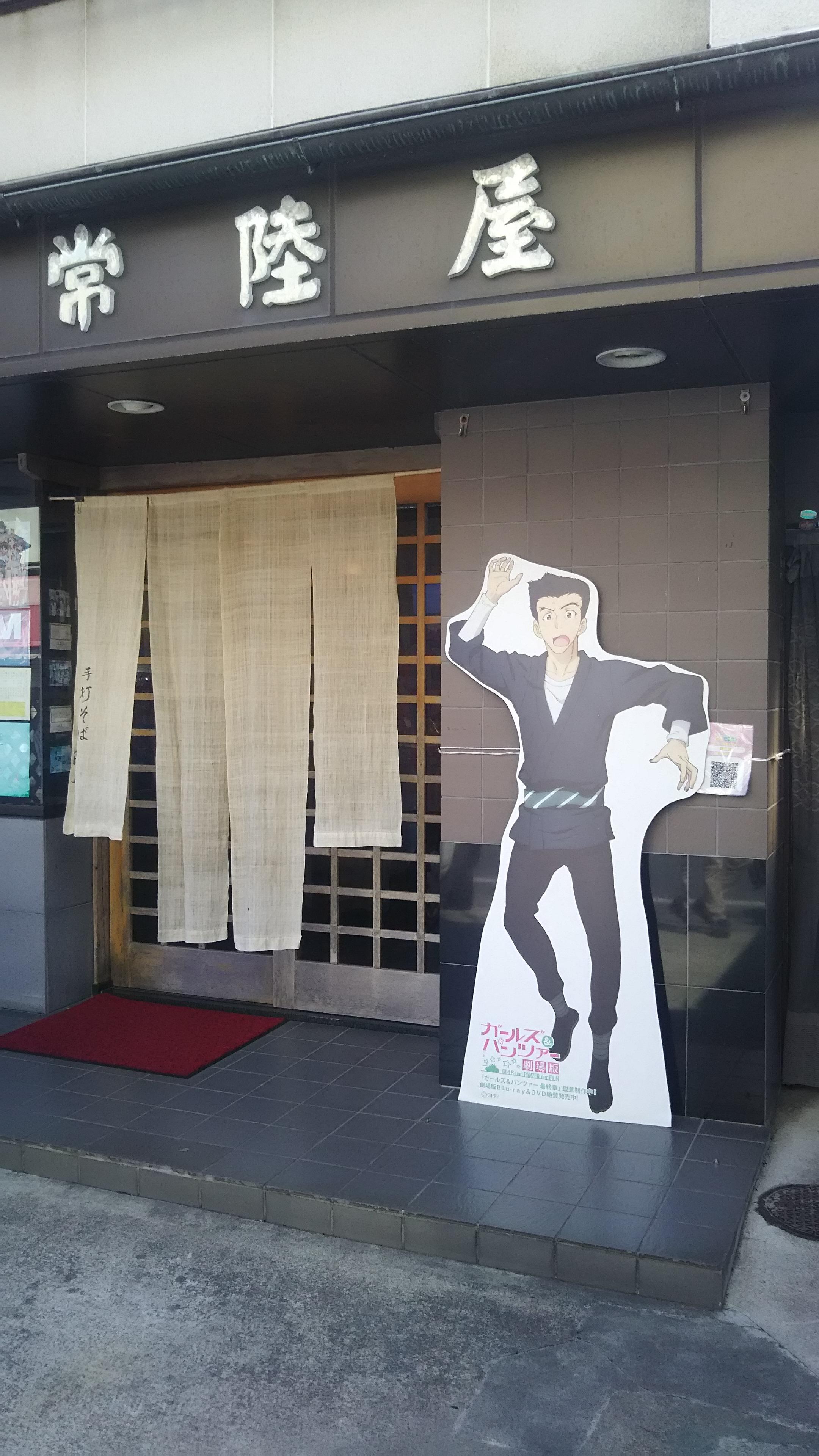 そんな賑わいを見せる街を歩いて、目的の蕎麦屋さん『常陸屋(ひたちや)』さんに到着しました。こちらのお店は、自家製粉の常陸秋そばを使った手打ちそば屋さんで、もちろん、店頭にはガルパンの登場人物のパネルが飾ってありました。店内にはセルフサービスの日本酒コーナーがあって、ぐい飲み一杯から自分の好きな銘柄を自由に飲むことができるんです。
