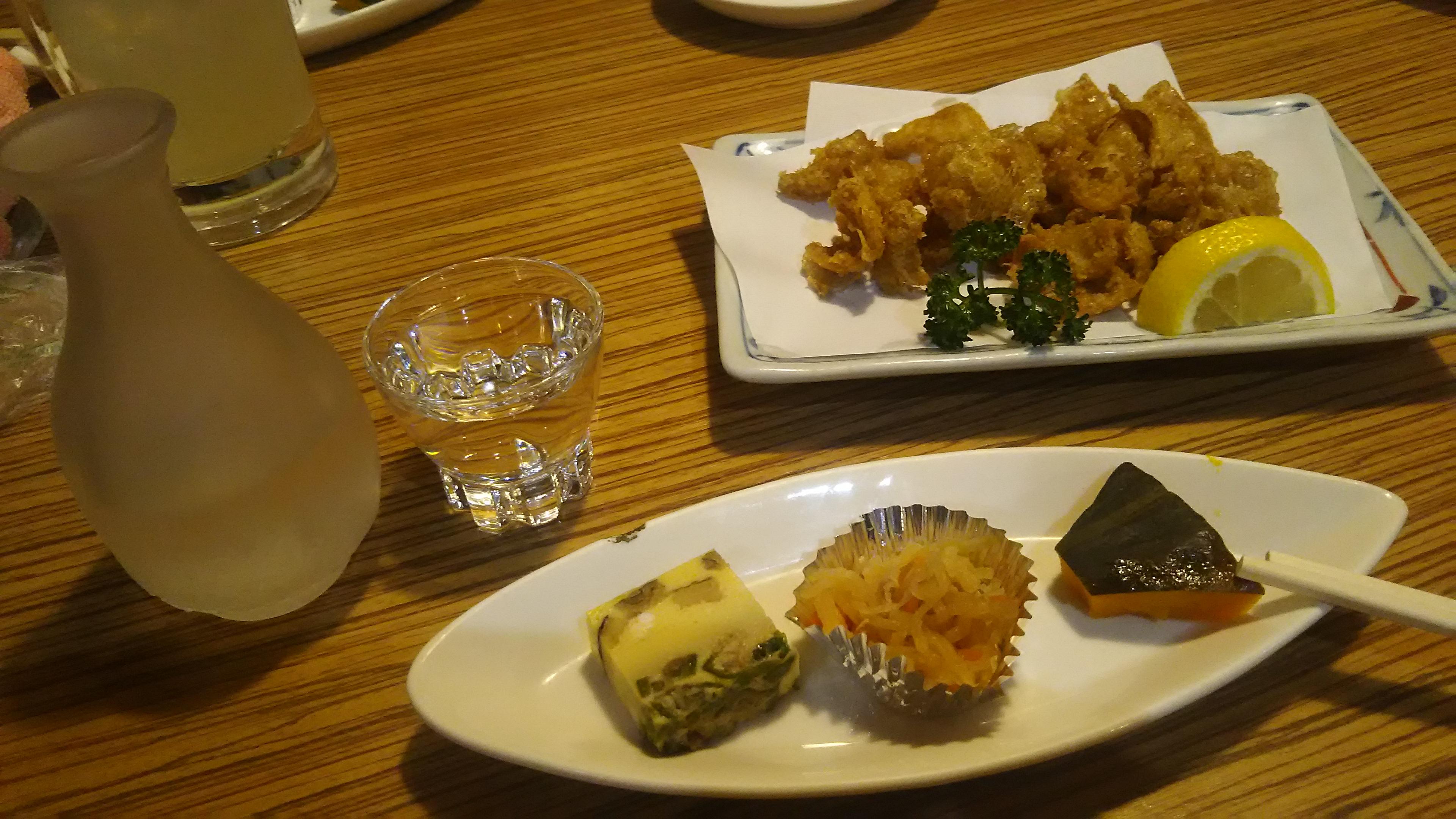 私は日本酒の霧筑波・特別純米生を、孝之さんは芋焼酎『カナブン焼酎』をオンザロックで、みどりさんは『レモンサワー』と、なんとも統一感のない乾杯となりました(笑)日本酒の品ぞろえは、観光客の方向けに地元茨城県の銘柄が多く、一合の徳利で提供されています。また、本格焼酎の品ぞろえは、麦、芋、蕎麦、などがあり、あの銘柄が・・・、と、焼酎ファンには嬉しいものが、一杯380円からと、とっても良心的な価格で楽しめます。
