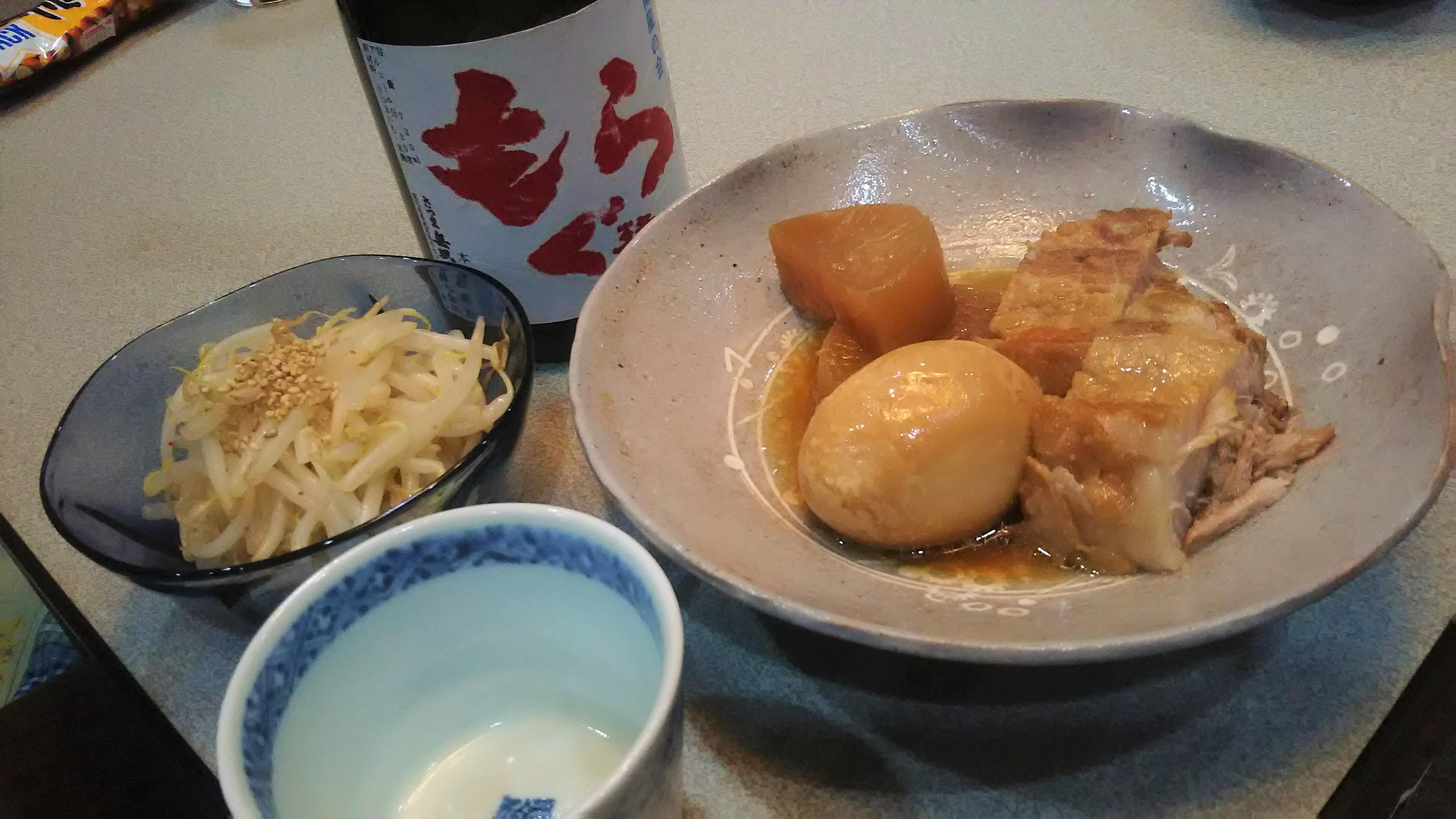 『赤もぐら』に合わせる今夜の肴は、『煮豚』ともやしの即席ナムルです。柔らかく味のしみた大根と卵と甘い香りの『赤もぐら』はとっても合います。お湯割りの割り加減は、先日のブログでもご紹介したように、はじめの一杯は濃い目で味わい、その後徐々に薄くしていきました。熱めのお湯割りの時にはガツンとした力強いコクが感じられ、少しぬるくなってくると柔らかな甘みに変化してくるので、一度で二度楽しめる美味しさです。
