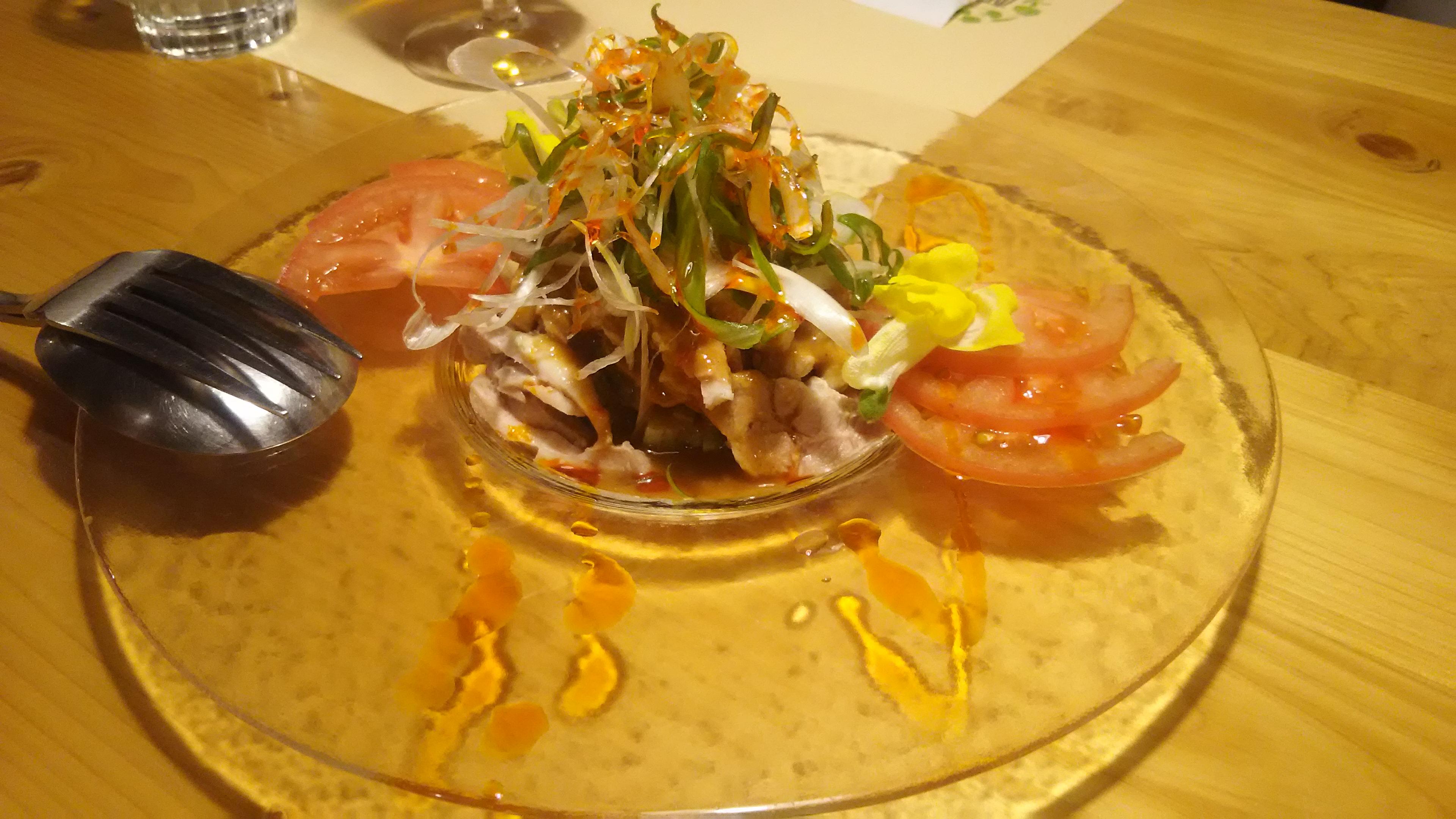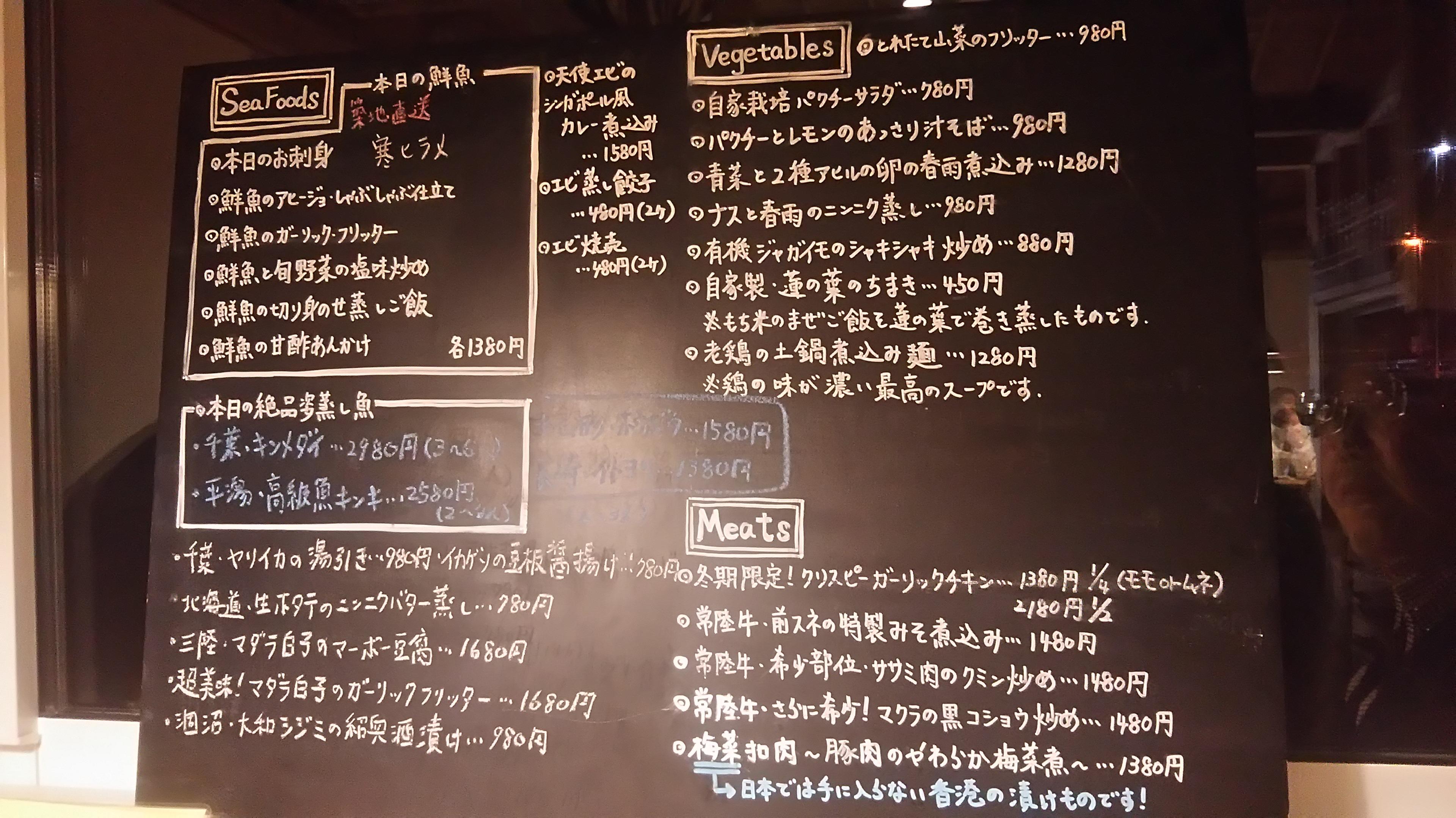 予約しておいた窓際のテーブル席に案内していただくと、お勧めの料理がびっしりと書き込まれた黒板が目に飛び込んできました。地元の食材にこだわったメニューには、常磐沖で捕れた旬の魚介類や常陸牛、旬の野菜を使った、見るからに美味しそうな料理がたくさんあって迷ってしまいます。先ずは、生ビールで軽く喉を湿らせてから、以前食べておいしかった『棒棒鶏』をつまみながらじっくりと考えることにしました。焦りは禁物ですからね~(笑)