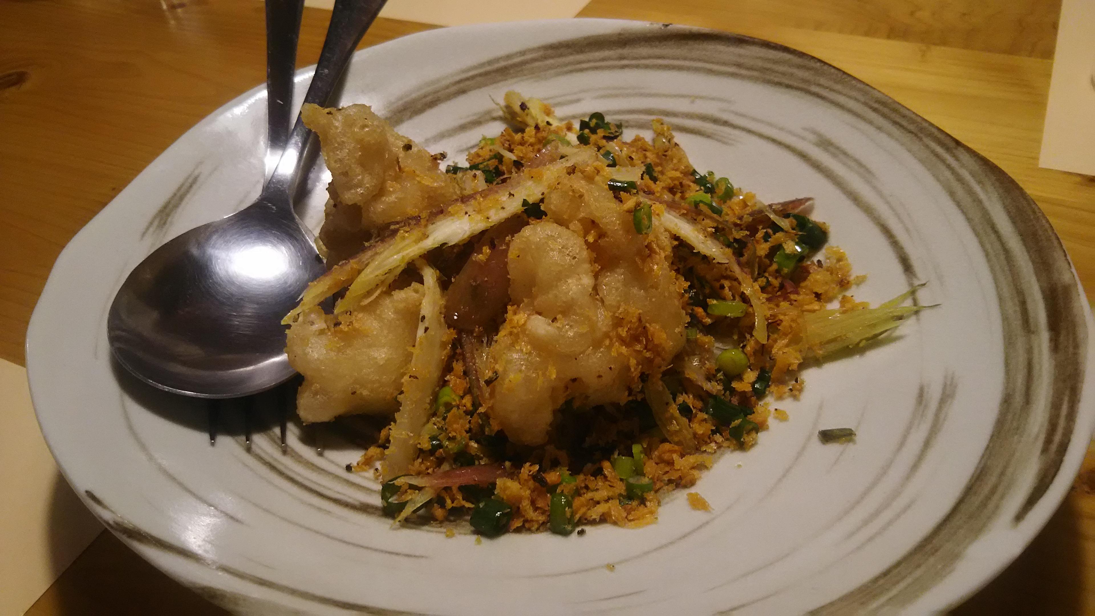 迷った結果、店長お勧めの『まだら白子のガーリックフリッター』と『エビシュウマイ』と冬季限定の『クリスピーガーリックチキン・ハーフサイズ』を、食事メニューから『チャーハン』と『五目あんかけそば』を注文しました。白子のフリッターは外はサクサク、中はフワフワで、付け合わせの香味フレークがたまらなく美味しかったです。そのまま白いご飯にかけて食べたいくらいです(笑)白子が苦手なみどりさんも美味しいと言って食べていたのには驚きました。