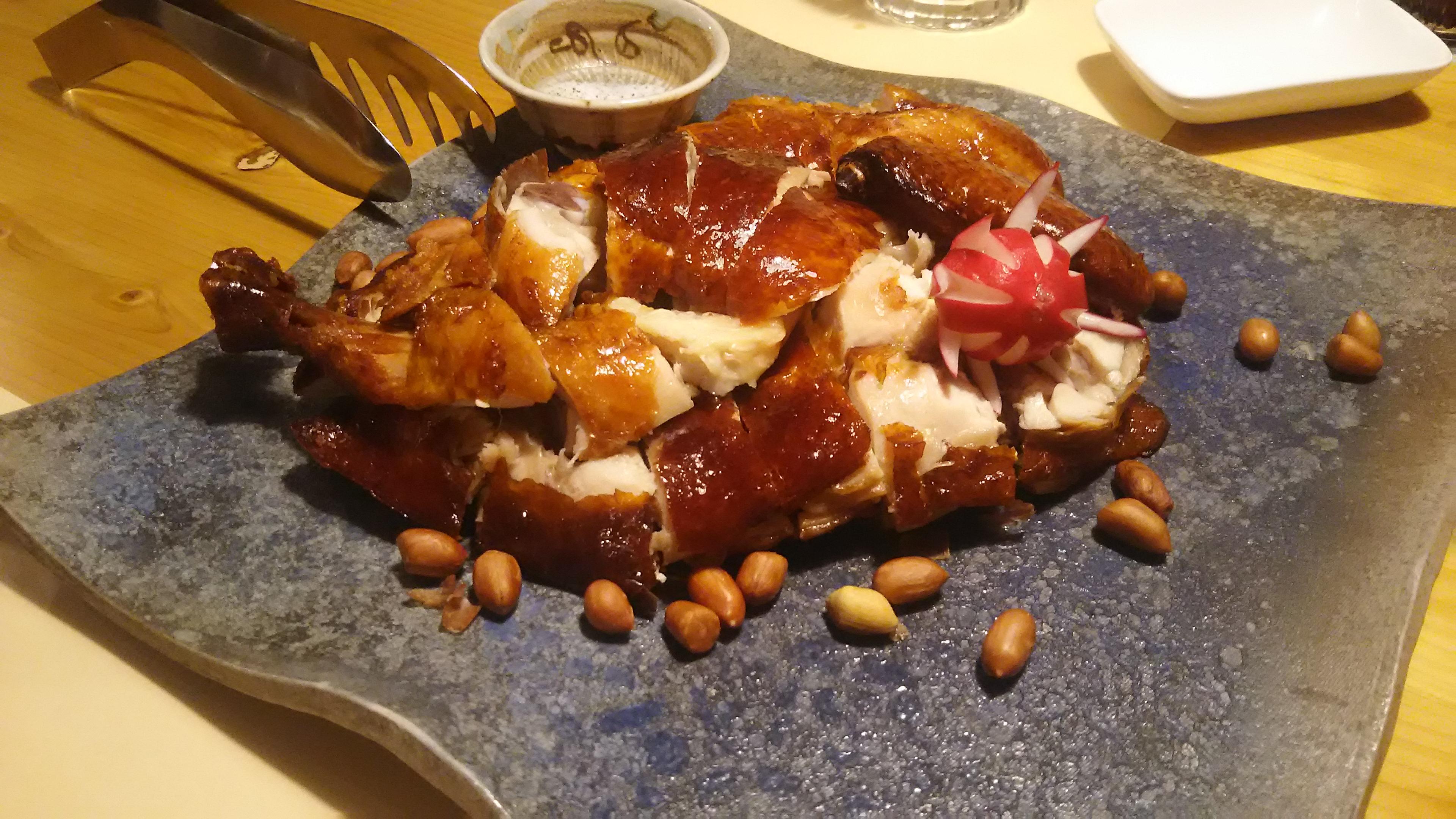そして、待ちに待った『クリスピーガーリックチキン』が運ばれてきて、見た目の豪華さにびっくり!艶やかな皮の照り具合は、まるで高級中華料理の『北京ダック』みたいでした(笑)付け合わせのピーナッツがとてもいいアクセントとなり、お塩でいただくと、鶏のジューシーな旨味が一層引き立ちます。店主おまかせ日本酒の『結・純米吟醸うすにごり』や『富久心・純米吟醸生原酒』との相性も良く、ついつい食べ過ぎてしまうくらいでした!