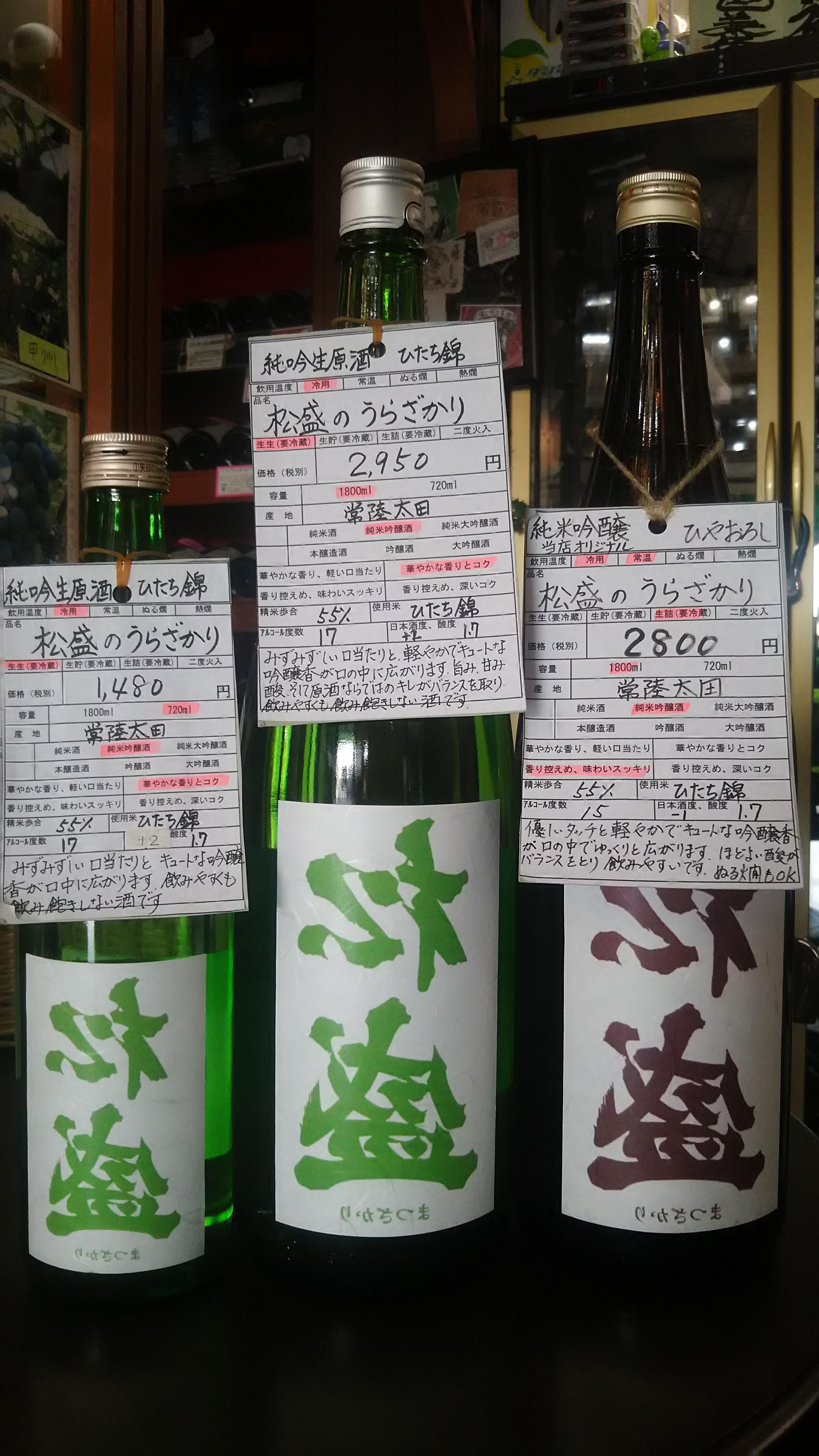 蔵の六代目の岡部彰博さんと、こんなものもあったら面白いかな~!と色々と相談しながら、あれこれ試してきましたが、やはり『うらざかり』の定番と言ったら『純米吟醸原酒』ですね!当店オリジナルということで『松盛』の文字を反転させたラベル使用し、新酒の時には『純米吟醸生原酒』を緑色の瓶に詰め、秋のひやおろしには茶色の瓶に一度火入れした『純米吟醸生詰め原酒』詰めています。