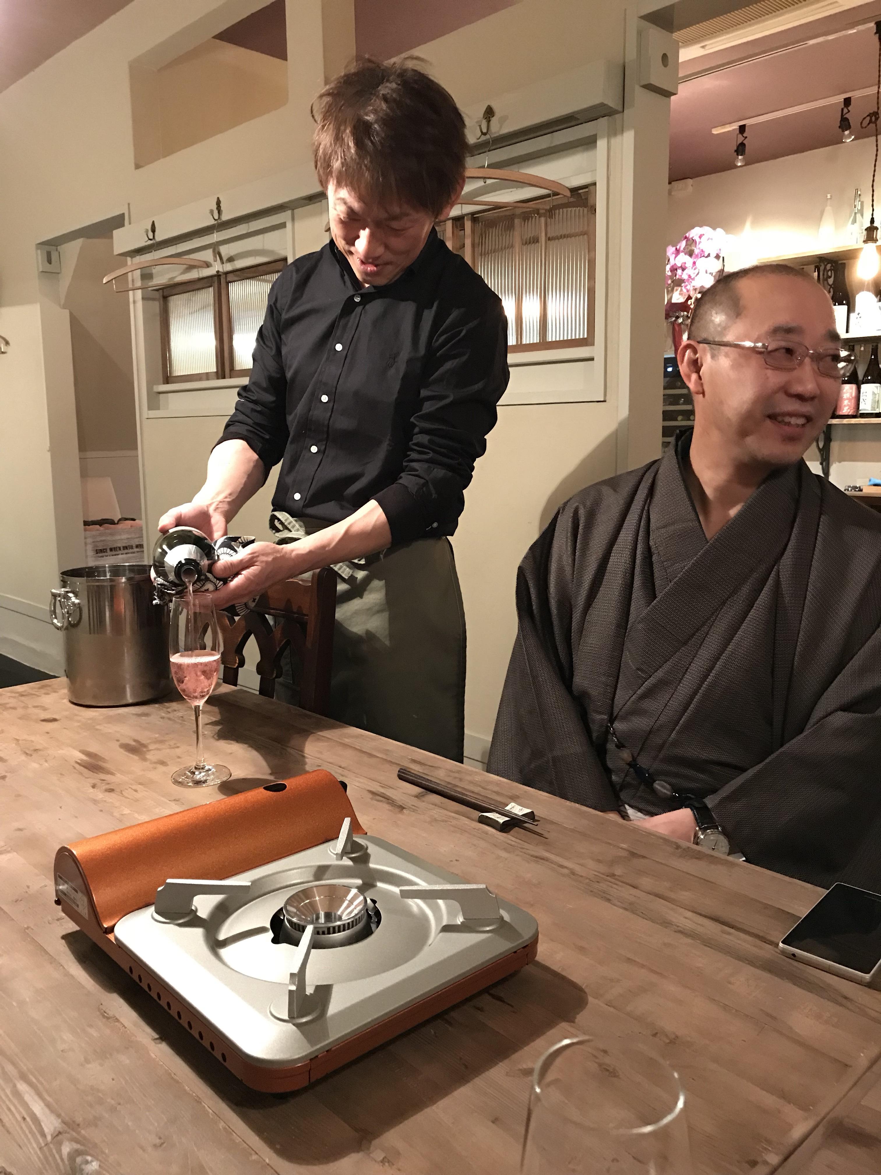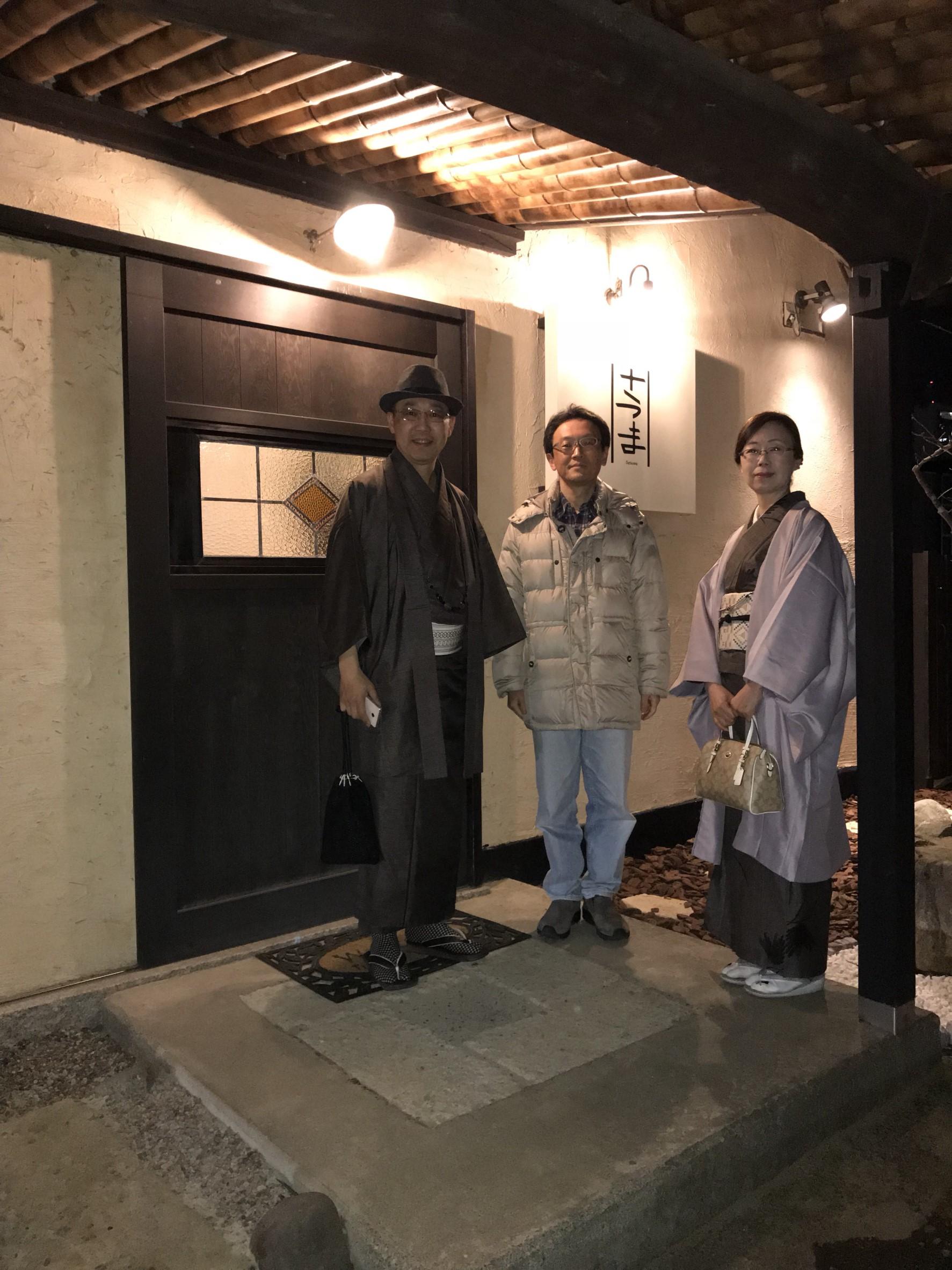 昨日の日曜日は、笠原町に新しくオープンした『さつま』さんに友人と連れ立ってお邪魔してきました。こちらのお店は先日孝之さんがポワーポイントでお酒の商品のご提案をさせて頂いたお店様です。納品の際に何度かお邪魔してちらりと店内を拝見させていただいて、とってもお洒落な雰囲気でしたので、私とみどりさんは着物で行くことにしました。
