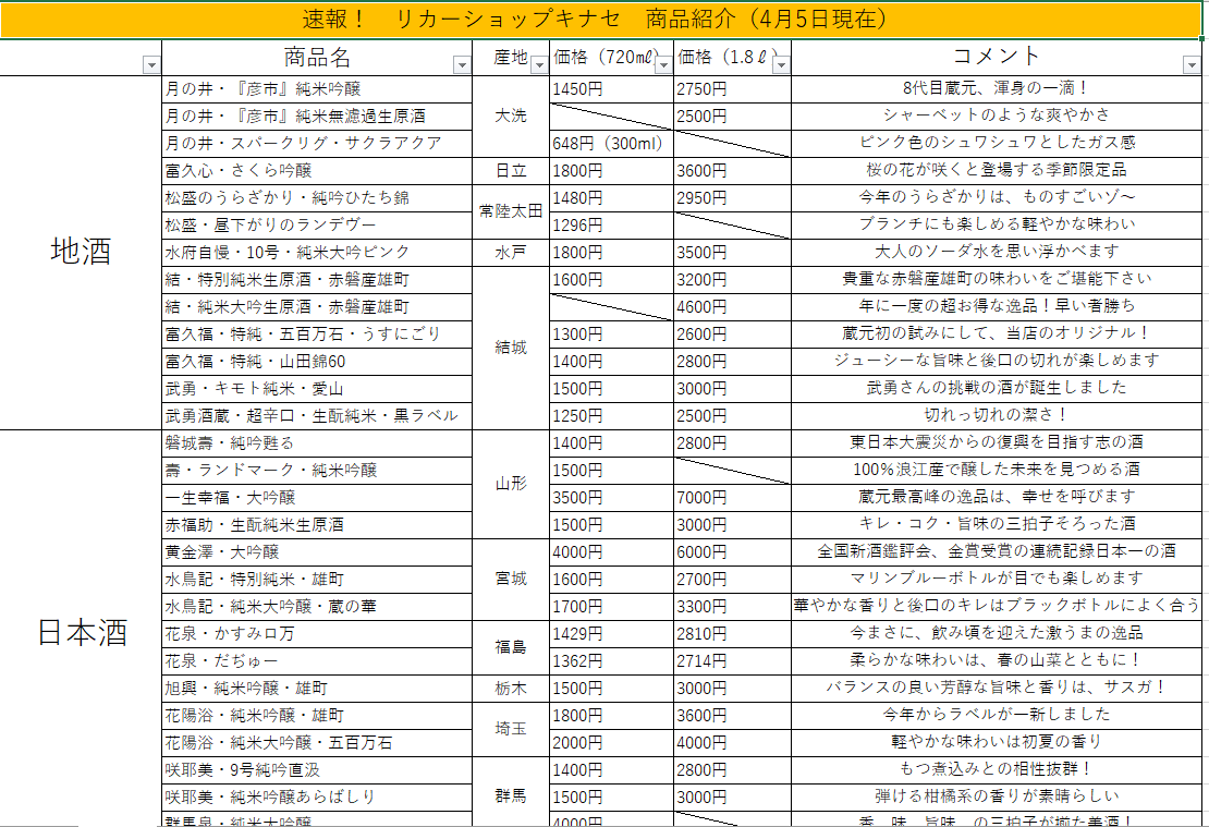 この度、『速報!最新入荷情報リスト』を更新しました。今の季節は、新酒の今シーズン最後の出荷となっていますので、今回のリストは日本酒に特化して、茨城県産酒と県外酒に分けてご案内しています。