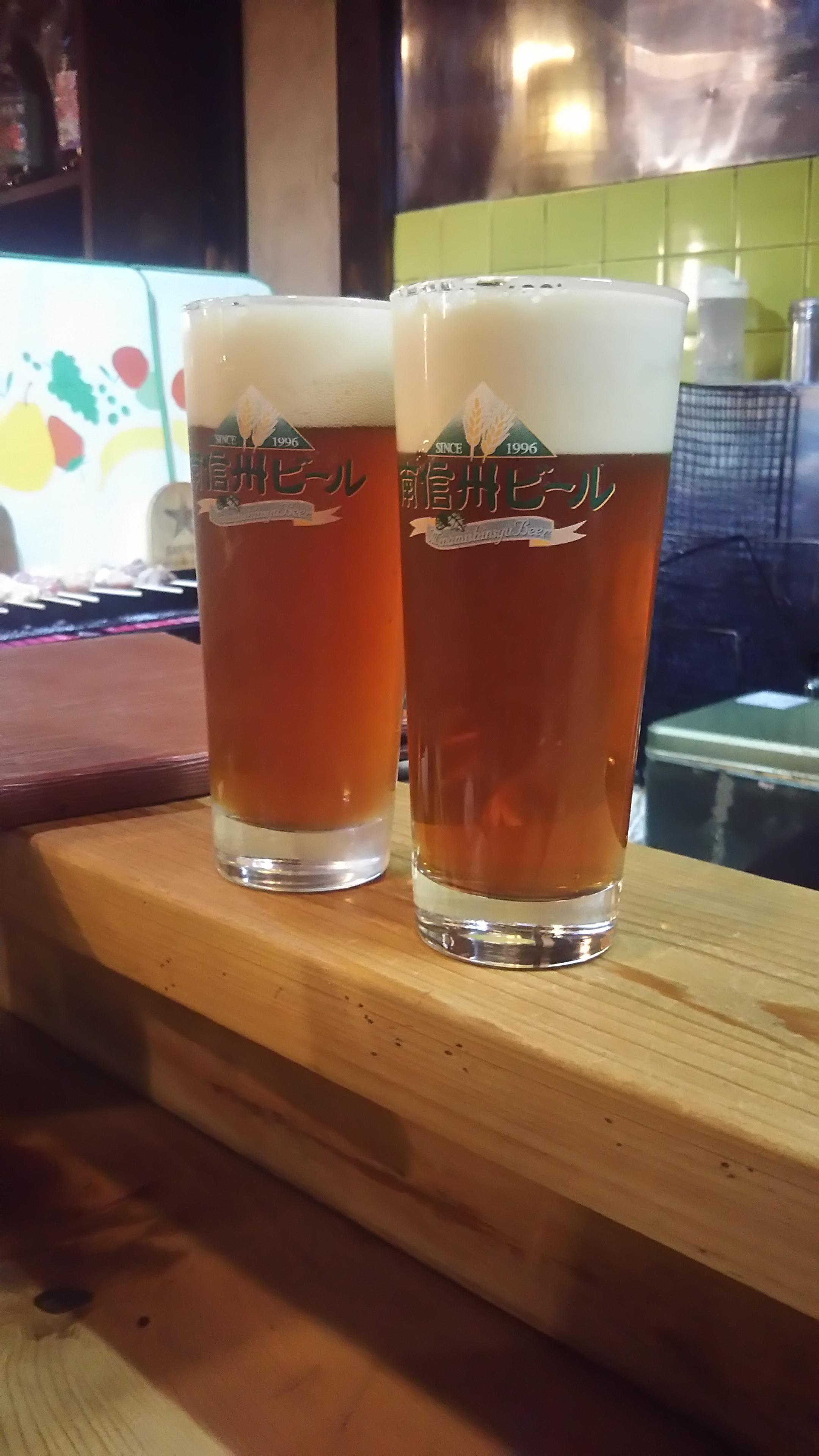 店内が混雑してきたところで、次は地元で評判の居酒屋『串正(くしまさ)』さんにお邪魔しました。こちらの串正さんは、10年以上も続く地元の繁盛店で、焼き鳥を始め、馬刺しや刺身など様々な料理とともに、地酒を楽しむことができます。クラフトビールの『南信州ビール』でこの日二度目の乾杯をしました(笑)