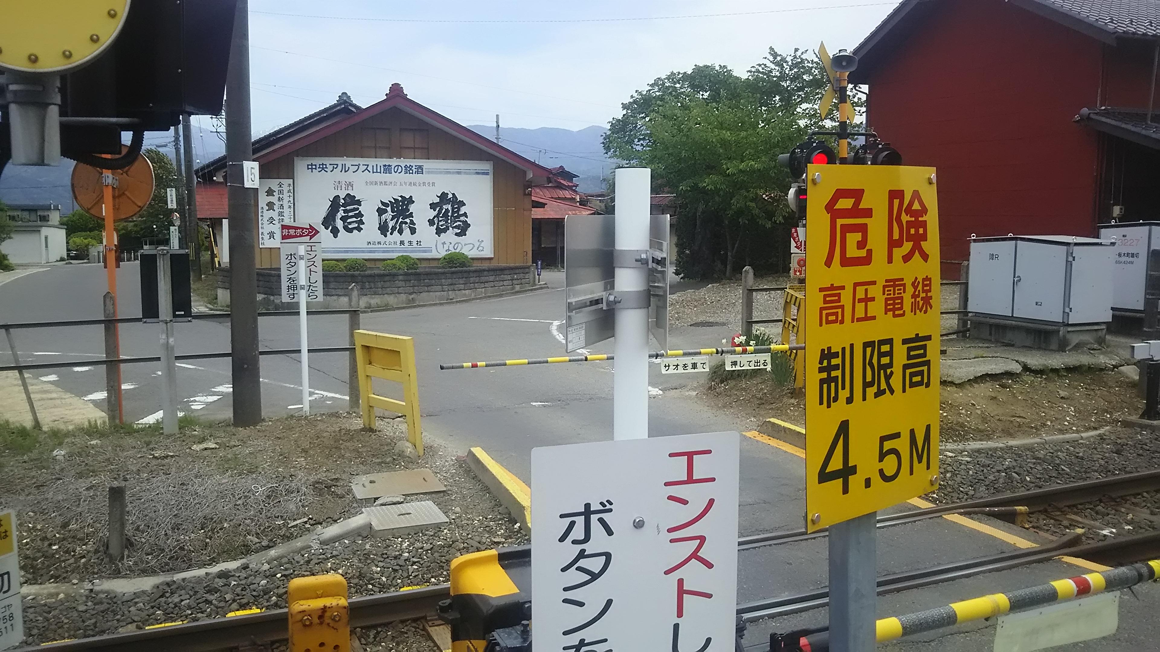 ソースカツ丼でお腹も満たされて蔵に行こうとしたところ、滅多に閉まることのない飯田線の踏み切りの遮断機が降りていて、とても珍しい光景を見ることができました。