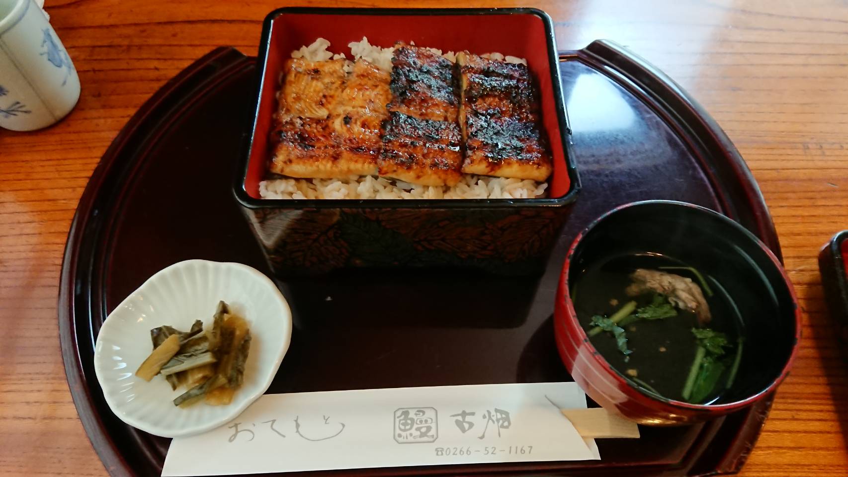 今回はだめかなぁ~と、一瞬あきらめかけましたが、運よく入ることができました。以前と変わらぬ店内で、さっそくメニューに目をやると『うな重』には、松・竹・梅・特梅があり、下から二番目の竹を注文しました。そして待ちに待ったうな重が登場!蓋を開けると紀州備長炭で焼かれた香ばしい香りが立ち上ります。しかも、このうな重は二段重ねになっているので、見た目以上に食べ応えがあり、大満足の上諏訪グルメでした。