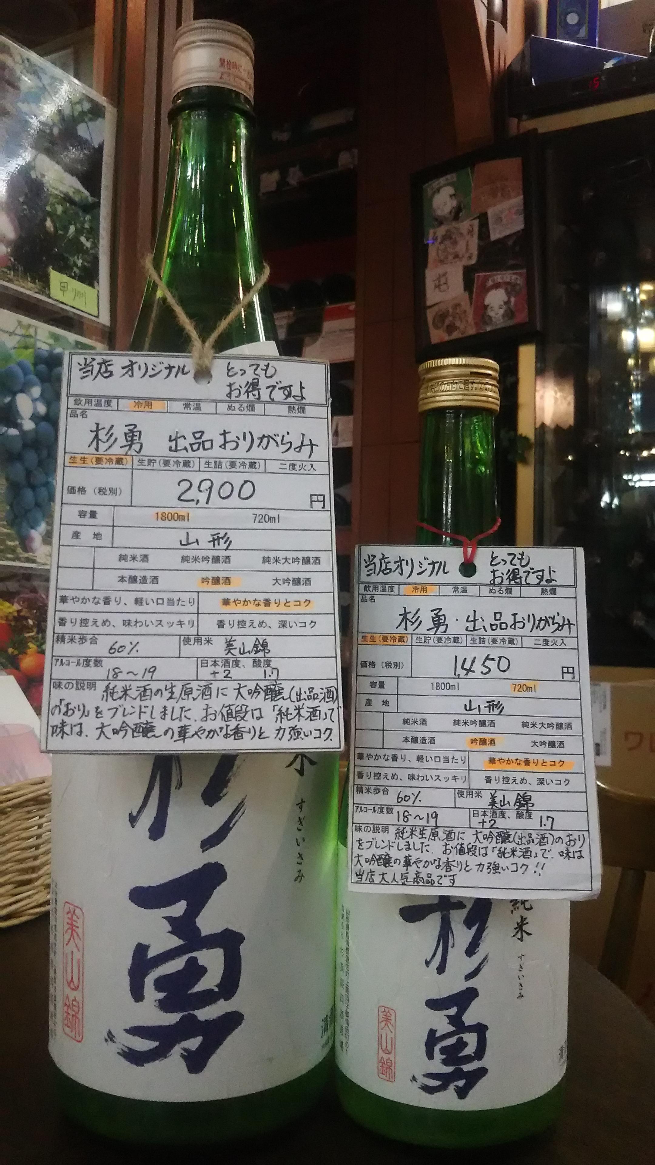 今日は天気予報の通り朝から晴れ間が広がって汗ばむような天気となっています。まさに、『夏酒日和』といった感じで、それに合わせるかのように今週は各蔵元から夏酒が続々と入荷しています。それらに交じって山形県の杉勇酒造さんの『杉勇・出品おりがらみ』がついに入荷してきました!当店オリジナル『キナセ・スペシャル』の中でも一番人気の高いお酒なんです。