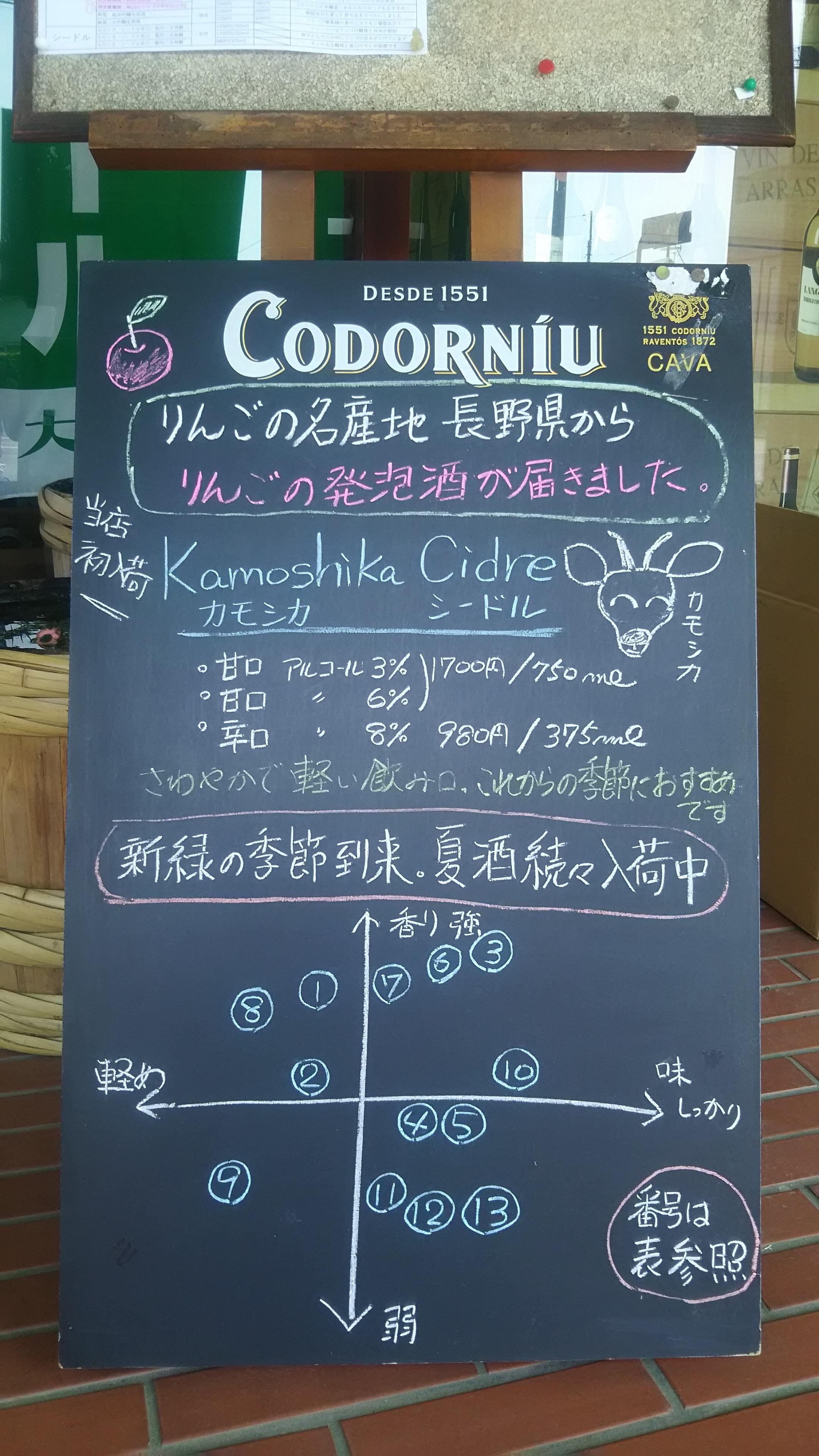 という事で、店頭の看板も『夏仕様』に書き直してみました(笑)。まずは、当店初入荷のりんごの発泡酒『カモシカ・シードル』です。このカモシカシードルはGWの連休に私と孝之さんが蔵を訪問し、お取引を始めさせていただきました。シードルはあまり馴染みのない方が多いかと思いますが、ブドウのスパークリングワインよりも酸味が柔らかいので飲み易いと思います。