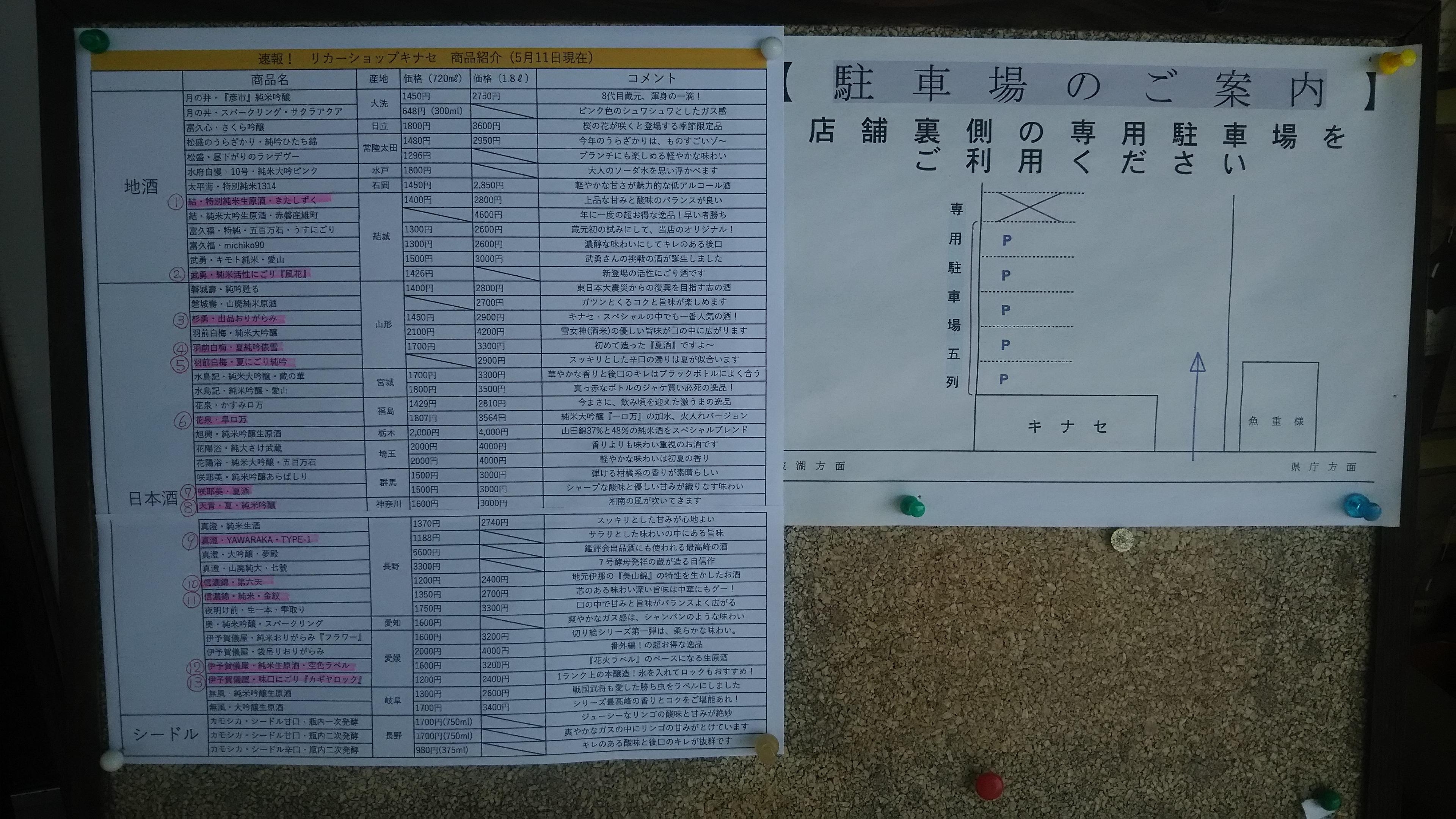 看板下半分の十字の表は、新しく入荷してきた夏酒の味わいを表しています。数字は、別紙の新入荷情報リストから新入荷の夏酒を13銘柄をピックアップしたものです。新入荷情報リストには、個別にコメントを書いていありますが、それだけでは相対的に比べるのが難しいので、味わい(軽い、しっかり)と香り(強、弱)の座標軸の表に表しました。この座標軸の表は前回試しに書いたところ、分かりやすいと好評をいただいたので、今回も引き続き使用いたしました。是非ご来店の際には、店頭入り口の看板をご覧ください。